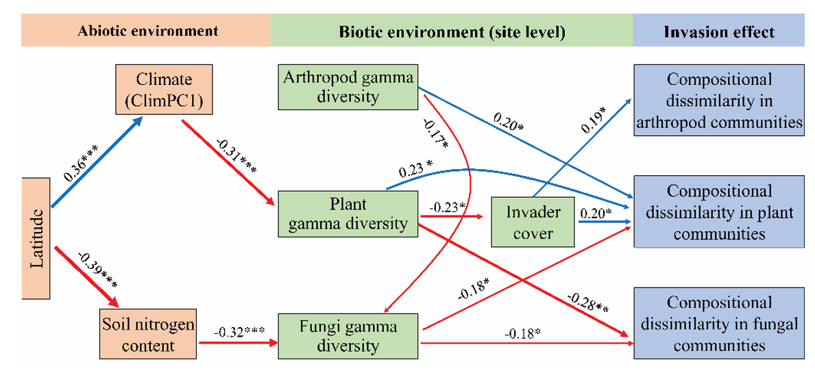 有鉴于此,课题组沿1700公里纬度带的124个样点开展野外调查,探讨了喜旱莲子草入侵对植物、土壤真菌和地上节肢动物群落多样性和组成的影响及其纬度变化规律。发现喜旱莲子草的入侵降低了植物群落β多样性、提高了土壤腐生真菌群落β多样性,而对地上节肢动物群落β多样性影响无显着。成对入侵和非入侵样地间植物和地上节肢动物群落组成的差异随纬度升高未表现出明显的变化趋势,但成对入侵和非入侵样地间土壤真菌(尤其是致病真菌)群落组成的差异随纬度升高而升高。采用结构方程模型阐释了潜在驱动机制(图1)。沿纬度梯度地上地下生物群落对外来物种入侵的差异响应可能打破地上地下生物间相互作用,影响后期物种入侵和生态系统功能。因此,基于单一地点或单一生物群落的研究低估了物种入侵的生态学效应,有必要在生物地理框架下综合评估物种入侵对多类群生物及其生物作用网络的影响。