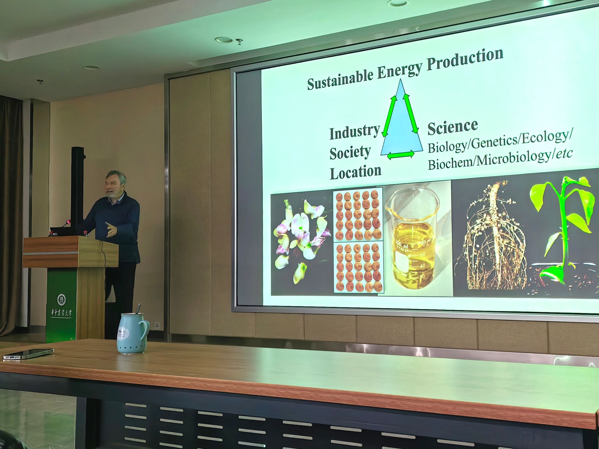 下午的学术报告以全球能源问题为起点,介绍了课题组对一种能产生可持续生物燃料豆科木本Pongamia pinnata功能基因组学的研究进展,以及其应用于改善自然环境、燃料、食物和饲用的场景。Gresshoff教授介绍,本研究的目标在于利用豆科植物自身对碳氮平衡的调节,减少全球碳排放,推进可持续新能源的发展。