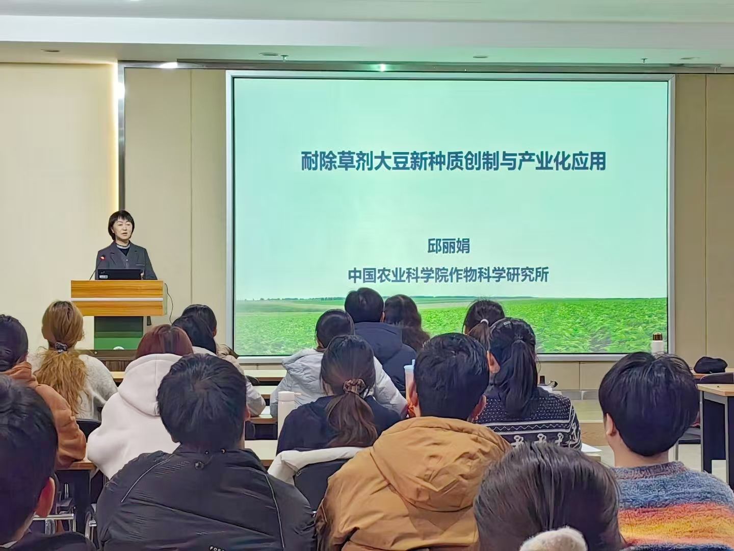 作物研究所邱丽娟研究员以“加速培育耐除草剂新品种,促进大豆绿色发展”为题,带来了一场精彩报告。本次报告由李霞教授主持。