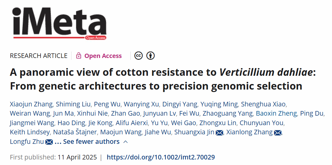 在棉花抗黄萎病遗传及全基因组选择育种技术研究中取得了新突破,为实现兼抗枯萎病、抗黄萎病的棉花育种提供了理论基础和技术方案。