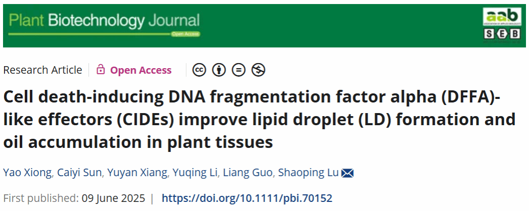 油菜团队研究成果以“Cell death-Inducing DNA Fragmentation Factor Alpha (DFFA)-like Effectors (CIDEs) improve lipid droplets formation and oil accumulation in plant tissues”为题在Plant Biotechnology Journal发表。研究揭示了动物脂滴蛋白CIDE在植物脂滴形成与油脂积累中的作用,并探索了CIDE影响油菜种子油脂积累的潜在机制。为油菜籽油增产提供了全新生物技术策略。