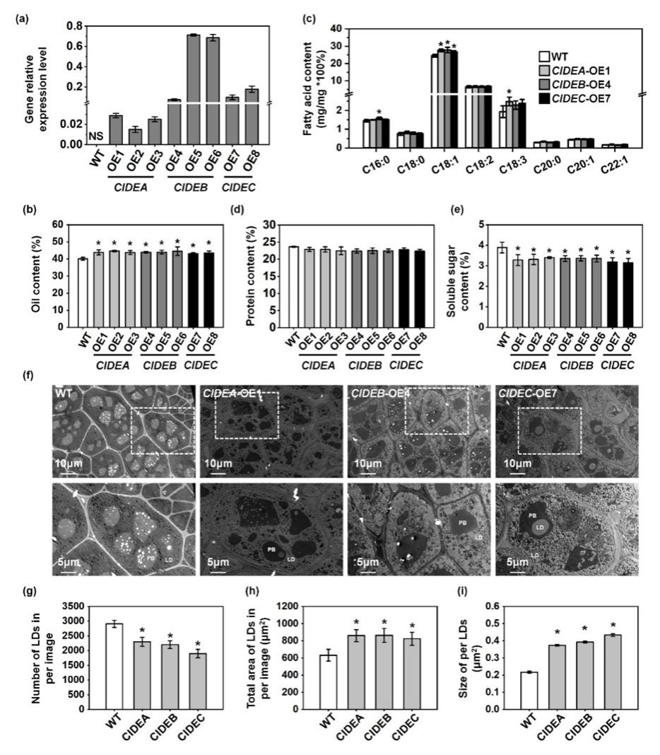 为探究CIDEs在甘蓝型油菜中的功能,在油菜种子中特异表达CIDE。近红外光谱分析显示,CIDEs过表达株系种子含油量较野生型(WT)提高7.4%-11.3%,其中油酸(C18:1)为主要增加的脂肪酸。CIDEs过表达株系种子的蛋白质含量与WT无差别,但可溶性糖含量显著降低。透射电镜(TEM)观察发现,转基因种子中脂滴体积显著增大。ImageJ定量分析表明,CIDEs过表达株系种子中脂滴数量减少20.9-34.7%,但单个脂滴面积增加76.2-104.7%,单位面积内脂滴总覆盖面积提升30.3-36.6%。对种子进行萌发试验,发现种子脂滴形态变化不影响种子萌发率。同时,CIDE不影响植物的农艺性状。进一步的研究表明,CIDEs的表达可以促进种子的糖酵解、TCA循环及能量代谢,最终促进种子油脂的积累。
