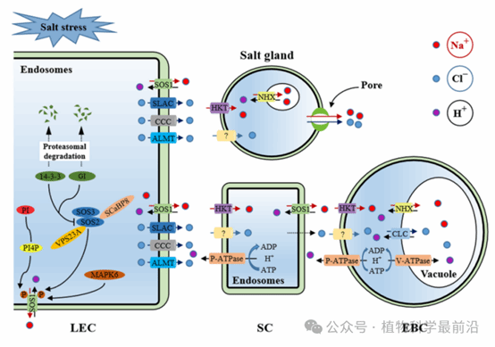 盐腺与盐囊泡排盐:盐腺在调节植物的离子平衡、维持渗透压稳定以及增加植物的盐分排出方面发挥着重要作用。盐囊泡是一种特殊类型的盐腺,主要由含有或不含中央大液泡的表皮盐囊细胞(EBCs)和叶表皮细胞(ECs)的基部柄细胞(SCs)构成。这三种细胞可以共同形成EC-SC-EBC复合体,成为附着在叶表皮细胞上的盐分泌结构。成熟的盐囊泡破裂后会释放出盐溶液,有助于减少植物体内的盐分积累,并提高植物对盐胁迫的耐受性(图3)。