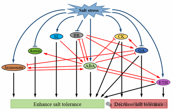 激素信号网络调控:植物激素,如生长素(Auxin)、脱落酸(ABA)、细胞分裂素(CK)、茉莉素(Jasmonate)、赤霉素(GA)、乙烯(ETH)、油菜素甾醇(BR)和独角金内酯(SL)在调节植物响应盐胁迫过程中起着关键作用。植物可通过调控植物激素含量与信号转导,并增强不同植物激素间的互作来适应盐胁迫(图4)。