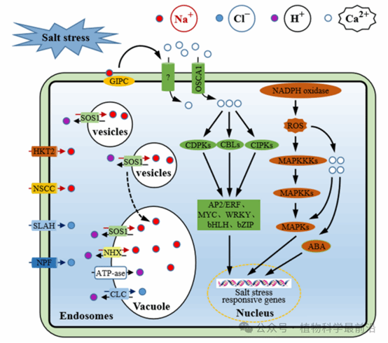 Ca2+信号调控:盐胁迫下,位于细胞质膜外表面的受体糖基肌醇磷酰神经酰胺(GIPC)能够触发细胞质中Ca2+的积累,增加Ca2+的浓度并增强Ca2+信号。Ca2+浓度的增加可以刺激Ca2+依赖性蛋白,通过增强Na+/H+反向转运体活性去除Na+,并减少非选择性阳离子通道(NSCC)介导的Na⁺吸收和转运,维持植物体内的离子平衡。此外,增强的Ca2+信号通过激活CDPKs、CBLs和CIPKs来调节核内早期转录因子如AP2/ERF、MYC、WRKY、bHLH和bZIP的表达,进而通过调节盐响应基因的转录来增强植物对盐的耐受性(图2)。