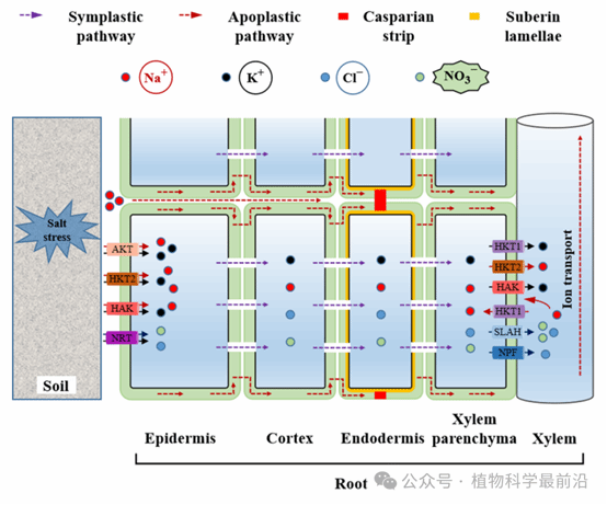 凯氏带与木栓层屏障:根内皮层的凯氏带和木栓层通过阻断质外体途径,减少Na+向地上部运输,增强植物拒盐性(图1)。