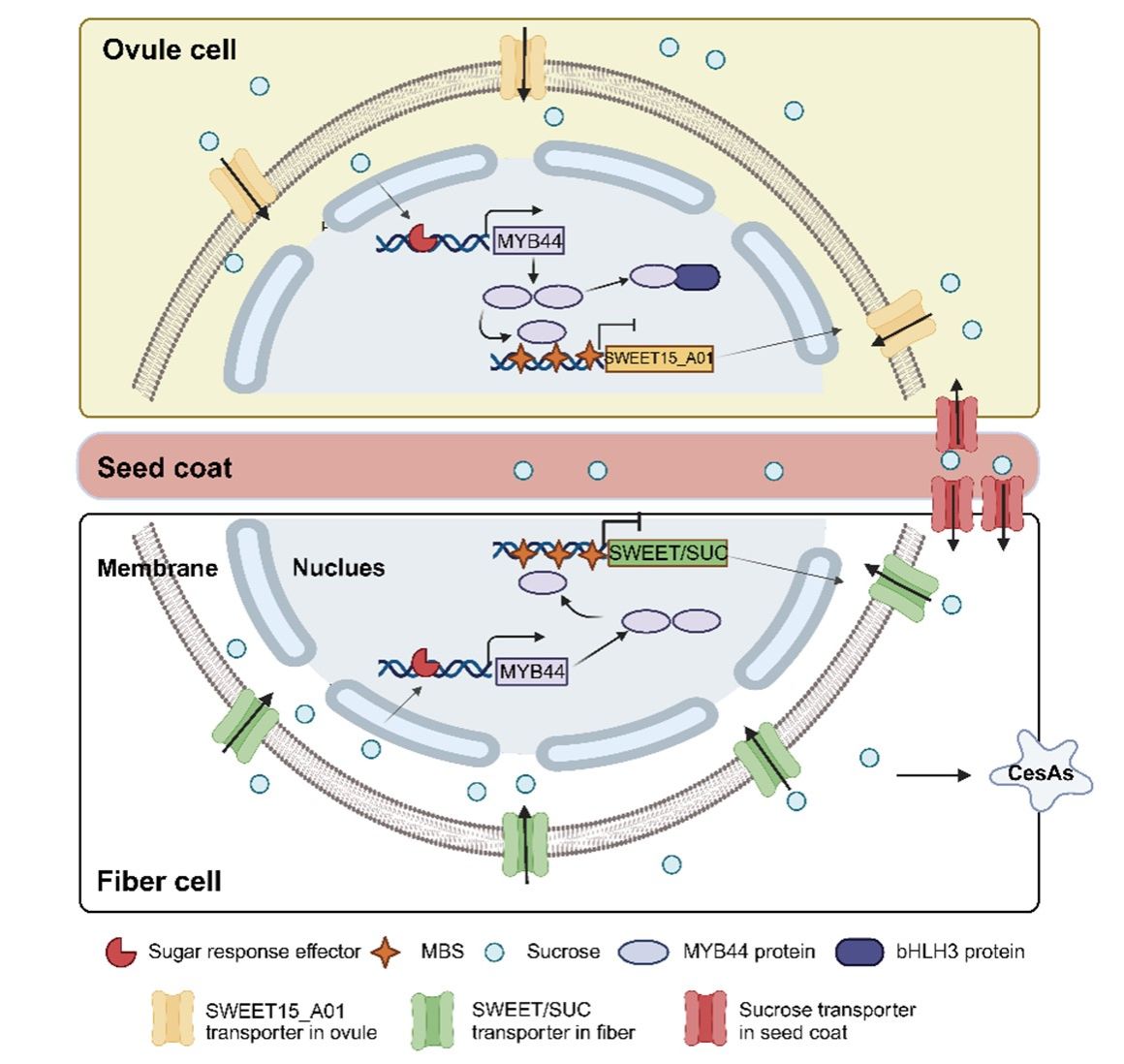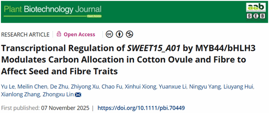 棉花遗传改良团队林忠旭教授课题组在Plant Biotechnology Journal期刊上在线发表了题为“Transcriptional Regulation of SWEET15_A01 by MYB44/bHLH3 Modulates Carbon Allocation in Cotton Ovule and Fibre to Affect Seed and Fibre Traits”的研究论文,揭示了MYB44/bHLH3-SWEET15_A01调节碳源在胚珠和纤维中的分配进而共同影响种子和纤维性状的分子机制。