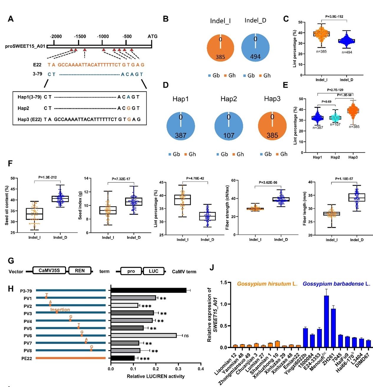 图1 SWEET15_A01启动子变异与棉籽油分和衣分显著相关