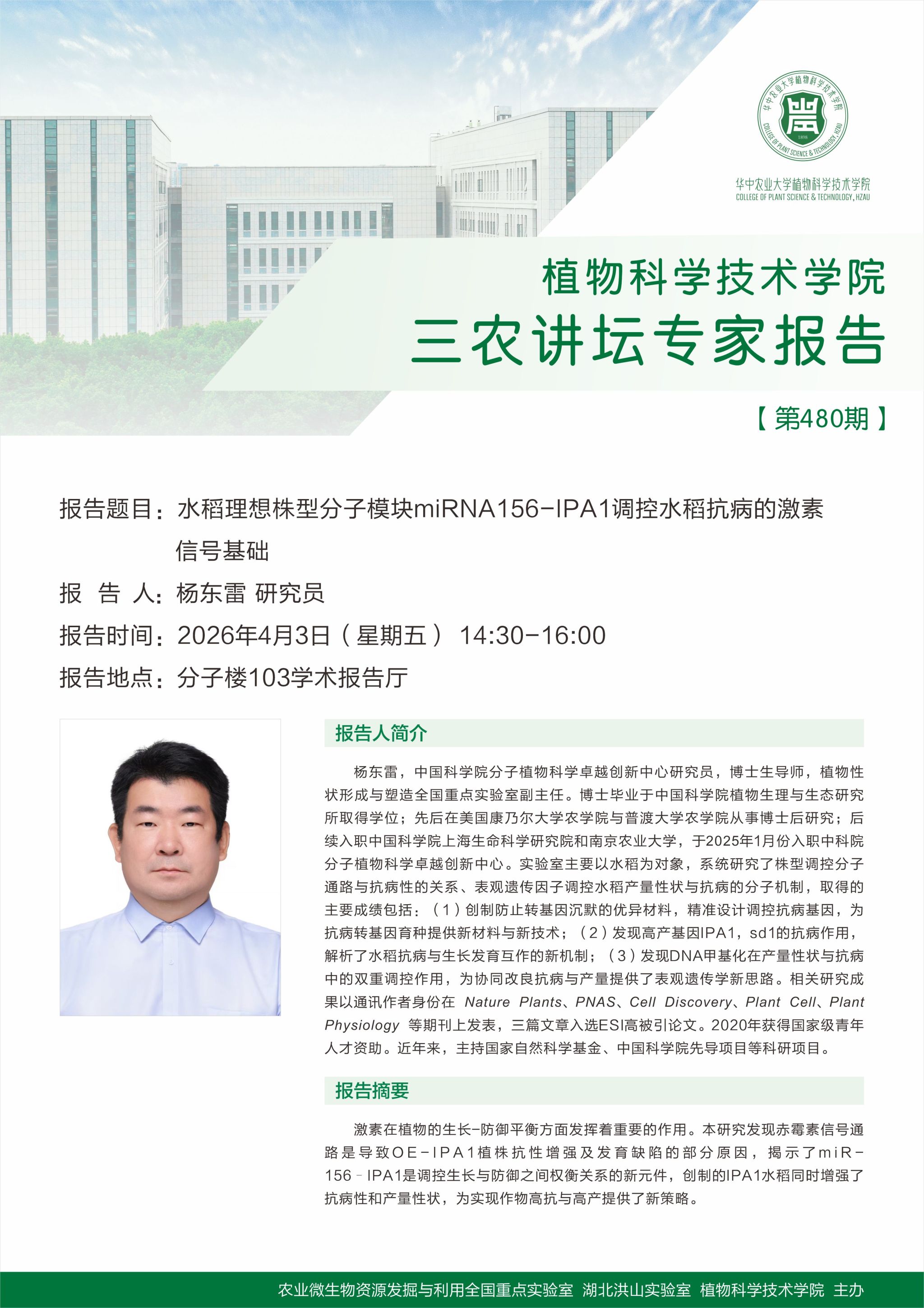 水稻理想株型分子模块miRNA156-IPA1调控水稻抗病的激素信号基础(杨东雷 研究员)