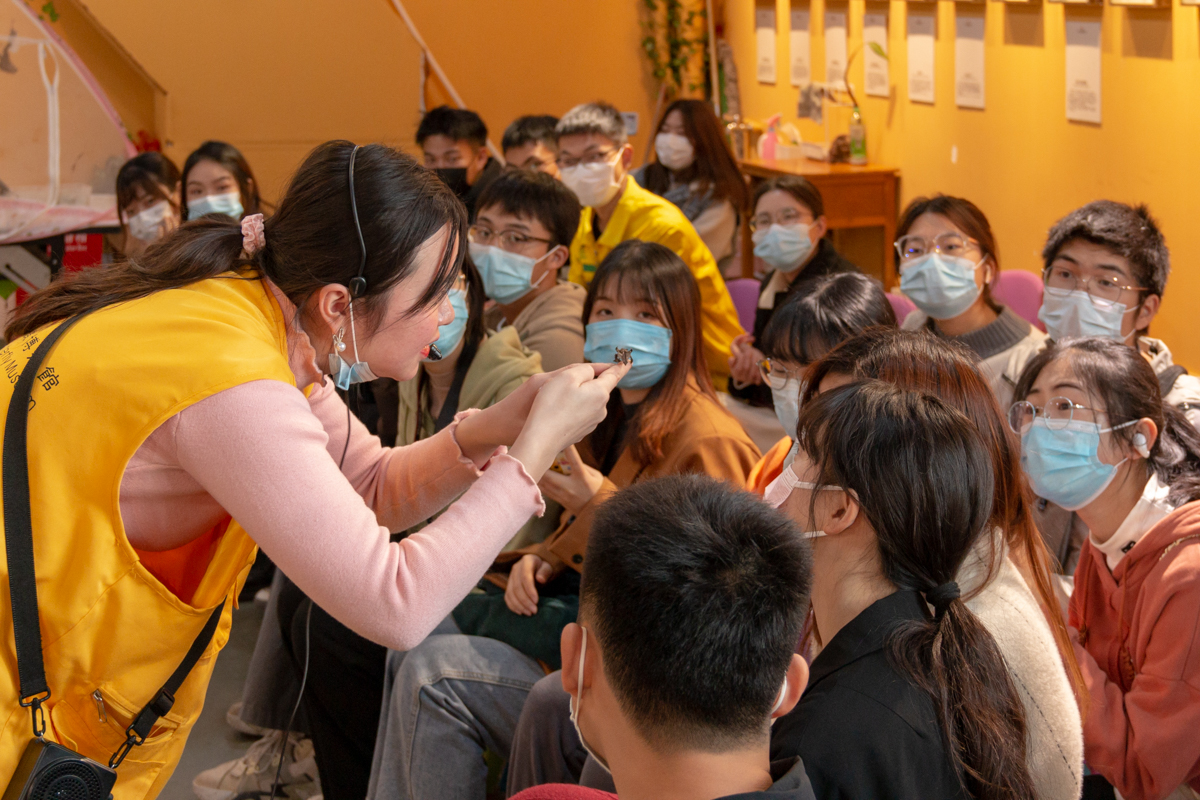 蝴蝶博物馆作为一个科普性博物馆,其中不仅有着不同品类、不同发育时期的蝴蝶,还有各类的昆虫和爬行动物,例如蜘蛛、蝎子、守宫、金蟾、玉米蛇、蜜袋鼯、龙猫、蜥蜴和各类甲虫等。在带队老师荣秀兰的争取下,同学们获得了与动物们亲密接触的机会。在馆长、讲解员以及一些植保专业同学的引导下,参观逐渐克服恐惧,纷纷参与到与小动物近距离接触的行列中。“当我问道,'可以头顶着这些动物吗'的时候,那位讲解员在后面,直接将那些小动物放到了我头上,当时我的内心非常的激动”,植保专业的刘桦与各种小动物的亲密接触后这样对记者说。在活动的最后,参观团队观察了玉米蛇的进食过程,合影留念后一同乘车返校。