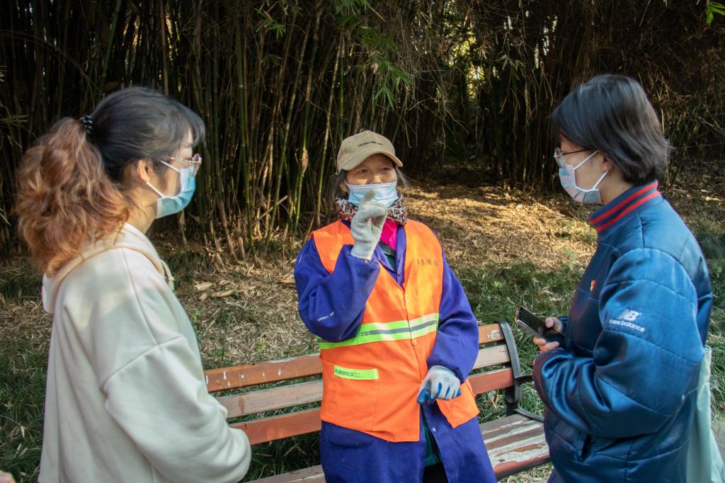 室外保洁部在岗员工40人,主要负责校园内七十五万平方米的清扫工作,但因为路段复杂、树种繁多,尤其以悬铃木等落叶乔木为主,在秋冬季节会大量落叶,为我们的工作带来了太多的不便。”负责人刘月姣老师向同学们简单介绍了室外保洁部的工作现状。“他们早上五点就要开始工作,每天还要将校园清扫三次。”当听到环卫工人的工作安排时,同学们肃然起敬,既惊讶于环卫工人们辛苦的工作日常,也为他们的坚守且乐观的态度感到震撼。