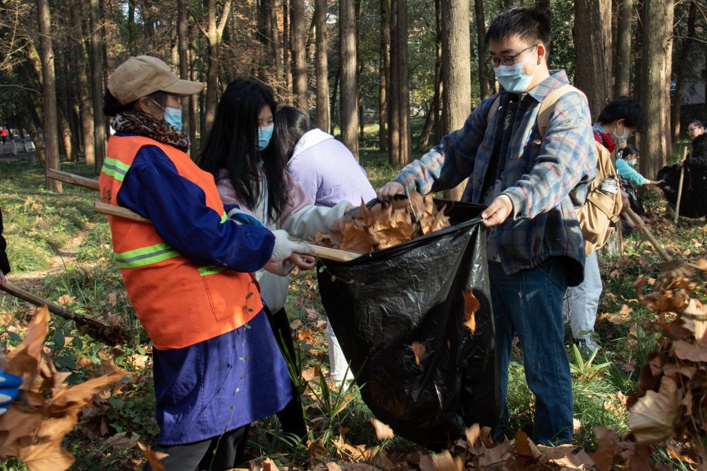 工作人员现场分配好劳动工具后,支部成员与环卫工人一同前往国际学术交流中心路边草坪,清理夹杂在草丛中的落叶。“使用草耙时,要尽可能地让其与地面水平,这样才不会造成较大的阻力,提高效率的同时还可以减少工具的损坏。”一位经验丰富的阿姨耐心地为同学们做起了示范,直起身时,不禁揉了揉发酸的腰,并继续讲解。支部成员也有样学样地耙起草,尝试着将枯黄的树叶翻出来,最后协力与环卫工人一同完成了责任区域的枯枝落叶的清理。