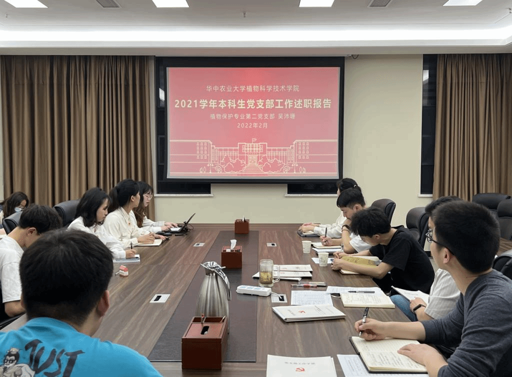 会上,7个本科生党支部围绕2021年党支部的支部建设、党史学习、特色活动、问题查摆与总结展望等方面,依次做出了详细报告。其中,农学专业第一党支部王正昌同志对主题党日活动的创新学习方式进行了介绍,并深刻总结了本支部的现存问题。植保专业第一党支部李善达同志分享了支部党史学习的“自学+领学+互学”新模式,将党史学习去形式化、落到实处。植保专业第二党支部吴沛珊同志从“每日推送,将党史学习融入生活”等活动讲述了本支部过去一年的所学、所做、所获。植科专业党支部宋诚成同志从本支部一年来党员发展情况出发,介绍了植科专业党支部2021年的支部建设情况以及未来一年的支部发展规划。种工专业党支部贾秦兰同志提到,种工专业党支部一直坚持开展“家乡有情”汇报活动,引导支部党员以优秀共产党员为榜样,向他们学习,努力奋进。智慧农业专业党支部许鑫彤同志谈到,大学生党员应该在展现大学生青春活力的同时,铭记肩上重担,擦亮党员底色。