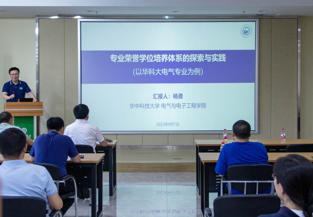 会议伊始,杨勇以电气专业为例,深入剖析了在新工科背景下专业人才培养需求的变化,他指出,人才培养要以产业需求为导向,注重提升学生解决复杂工程问题的能力,推进科教融合、产教融合,因此专业建设需要主动适应和引领未来发展需求,融入社会主义核心价值观培育,培养以民族复兴为己任、德才兼备的高层次人才。随后,杨勇展示了华中科技大学电气专业荣誉学位培养体系的具体结构。据了解,荣誉学位培养体系以解决专业与学工、教书与育人、科研与教学、课内与课外相互分离,难以统一的问题、吸引学生投身更具挑战性学术研究类和工程实践类精深课程,开展自主性深度学习,注重尖峰体验、激励和引导学生胸怀理想、追求卓越、超越自我为宗旨,以明德铸魂、五育融通、精课强基、实践赋能为主要人才培养框架,在注重课程思政、促进科教融合的教育环境下,着力提升学生的创新能力,推进学生个人成长与全面发展。