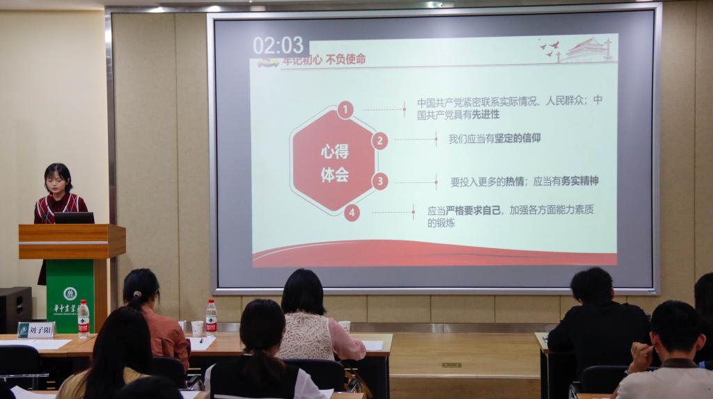 会议最后,本科生辅导员张露进行总结发言。她对各位入党积极分子的成绩给予充分肯定,并对候选人汇报展示提出相应建议。她向全体成员寄语:“党员同志们要利用好身边每分每秒的空余时间进行理论学习,提升自己的综合素养;实事求是,以端正的态度承担起党员的职责,充分发挥学生党员先锋模范作用。"