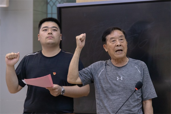 入党宣誓仪式伊始,全体党员起立,所有人在一片庄严肃穆的氛围中重温《国际歌》的旋律。奏唱完毕后,贾浩洋宣读2021上半年新发展的107位党员名单。