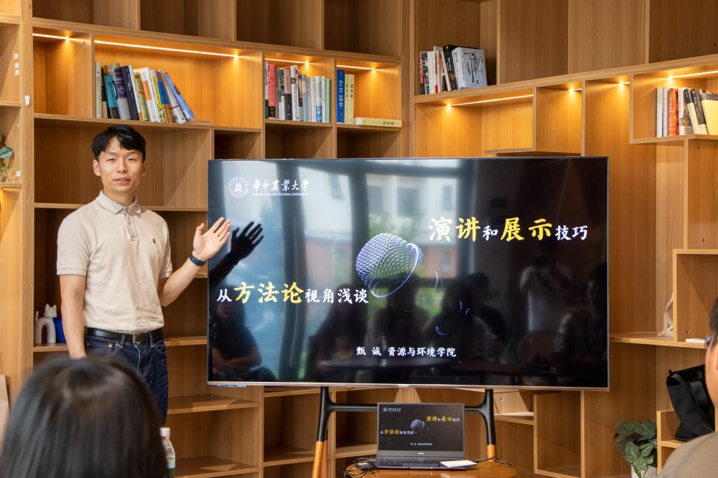 甄诚以“从方法论视角浅谈演讲和展示技巧”为主题,以ppt为媒介,围绕其思路、结构和亮点等内容展开探讨。他用一张白底黑字的PPT为题,引入了本次分享的第一环节---PPT封面的确定。通过一步步互动与PPT的逐步变化,理论结合实际,生动的为同学们讲解了PPT封面的制作,并强调了在制作过程中校徽的使用以及如何利用字体和颜色变化突出演讲内容。甄诚认为,演讲标题可以采用“50%陌生+50%熟悉”的公式,跳出常规、抓人眼球,从“关于演讲与PPT制作的分享”到“从方法论视角浅谈演讲和展示”的变化就最好地体现了此技巧的妙用。