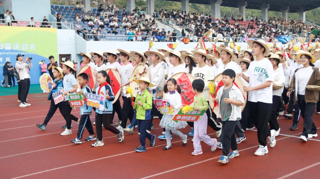 师生入场方阵在引导员的引领下,踏着铿锵有力的步伐,缓缓步入运动场。方阵成员手持书有“粮安天下”的毛笔字的圆形簸箕、以“种子画”制作而成的中国地图和油菜、水稻、小麦、棉花、玉米、大豆、蝴蝶等各式特色手持物,头戴草帽,它们不仅生动展现了91免费版