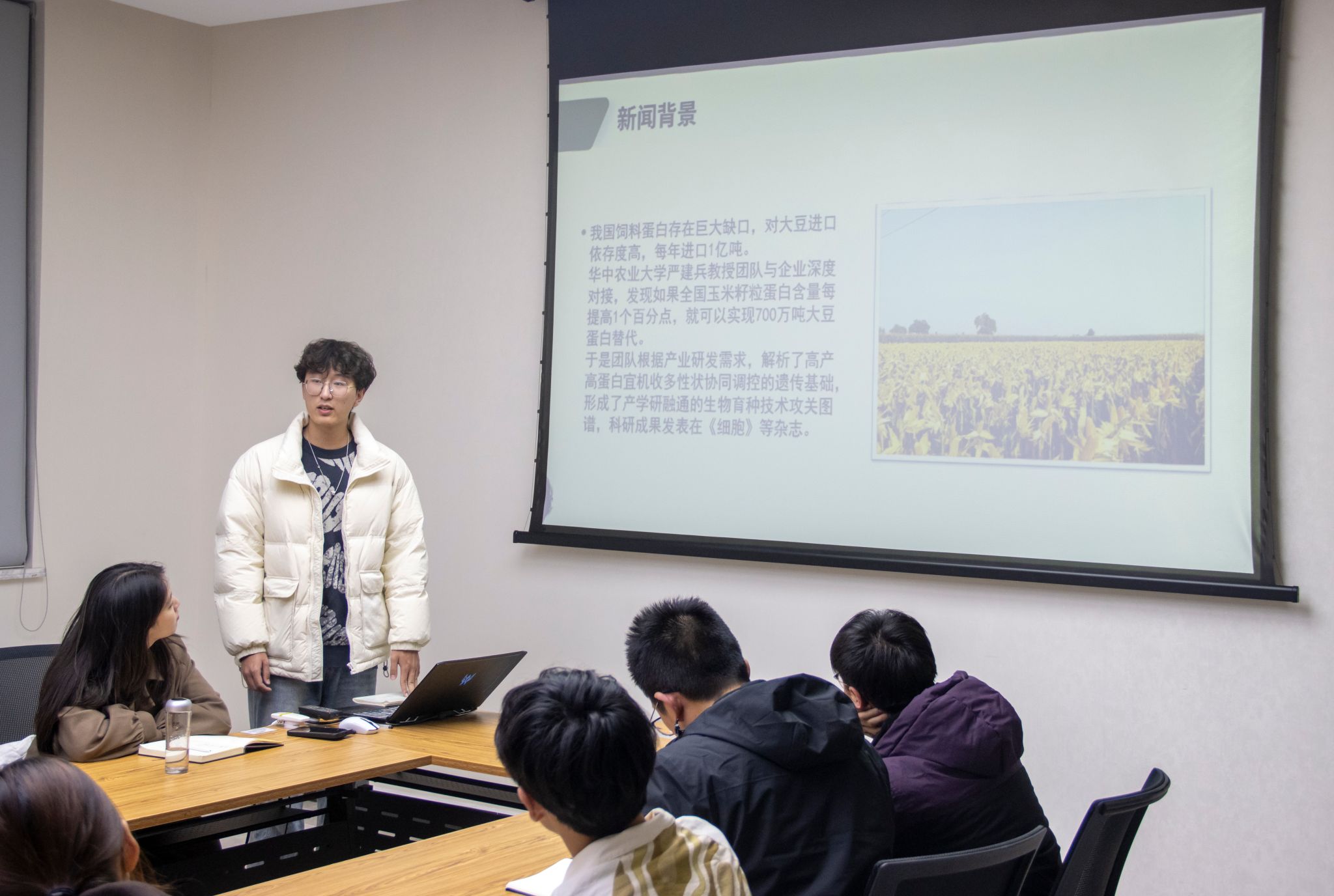 在学习交流环节,于子杰同学深入学习了习近平总书记在湖北考察时的重要讲话精神。他分享到:“作为农科学子,我们肩负着推动农业现代化进程、保障粮食质量与安全、提升粮食生产效率的重任,我们要以实际行动践行科技创新的理念,坚守粮食安全的防线。”