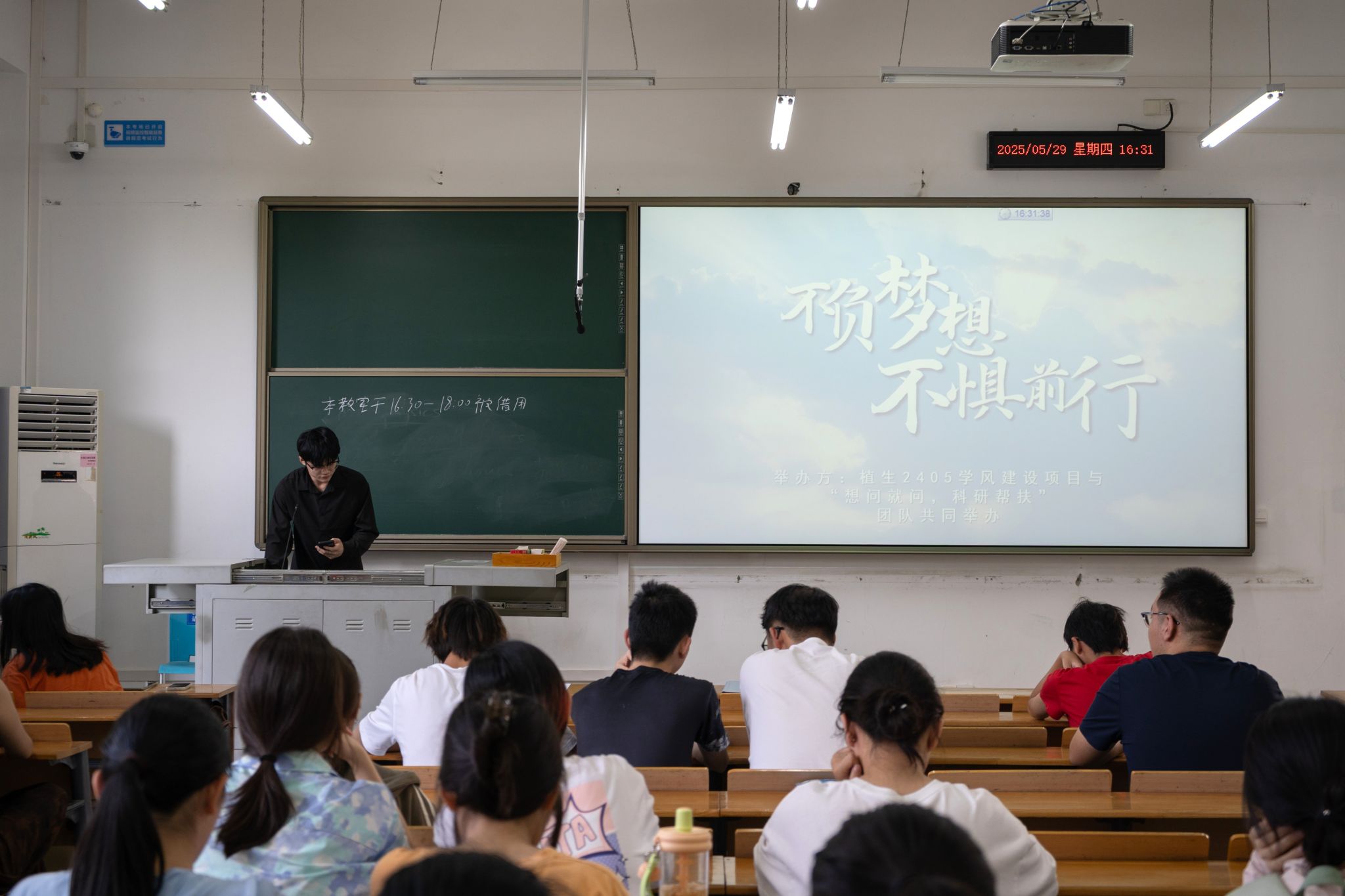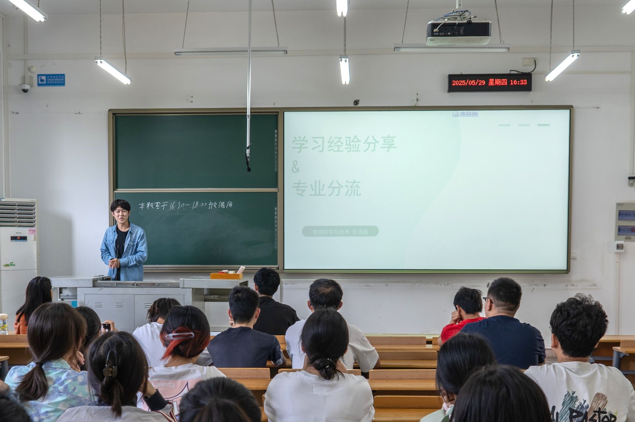 植生2405班在四教A108教室举办“朋辈领航”经验分享会,邀请种工2201班李英、植科2201班张涵超、应生2201班朱书峰分享学习经验,约50位24级学生参与活动。