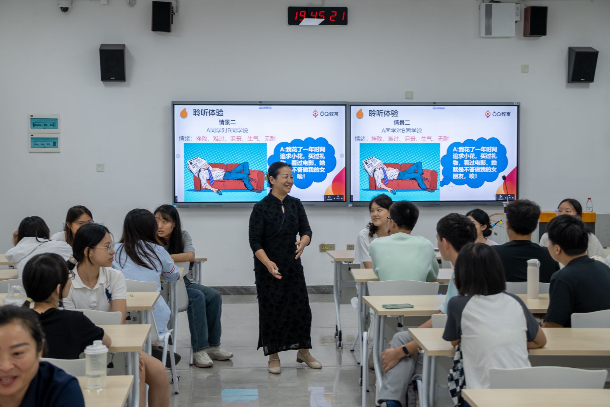 互动环节,同学们两两配合情景演练,模拟“催交作业”等典型的交流冲突场景。通过对比不同沟通方式的效果,参与者深刻体会到积极沟通对化解矛盾的重要性。