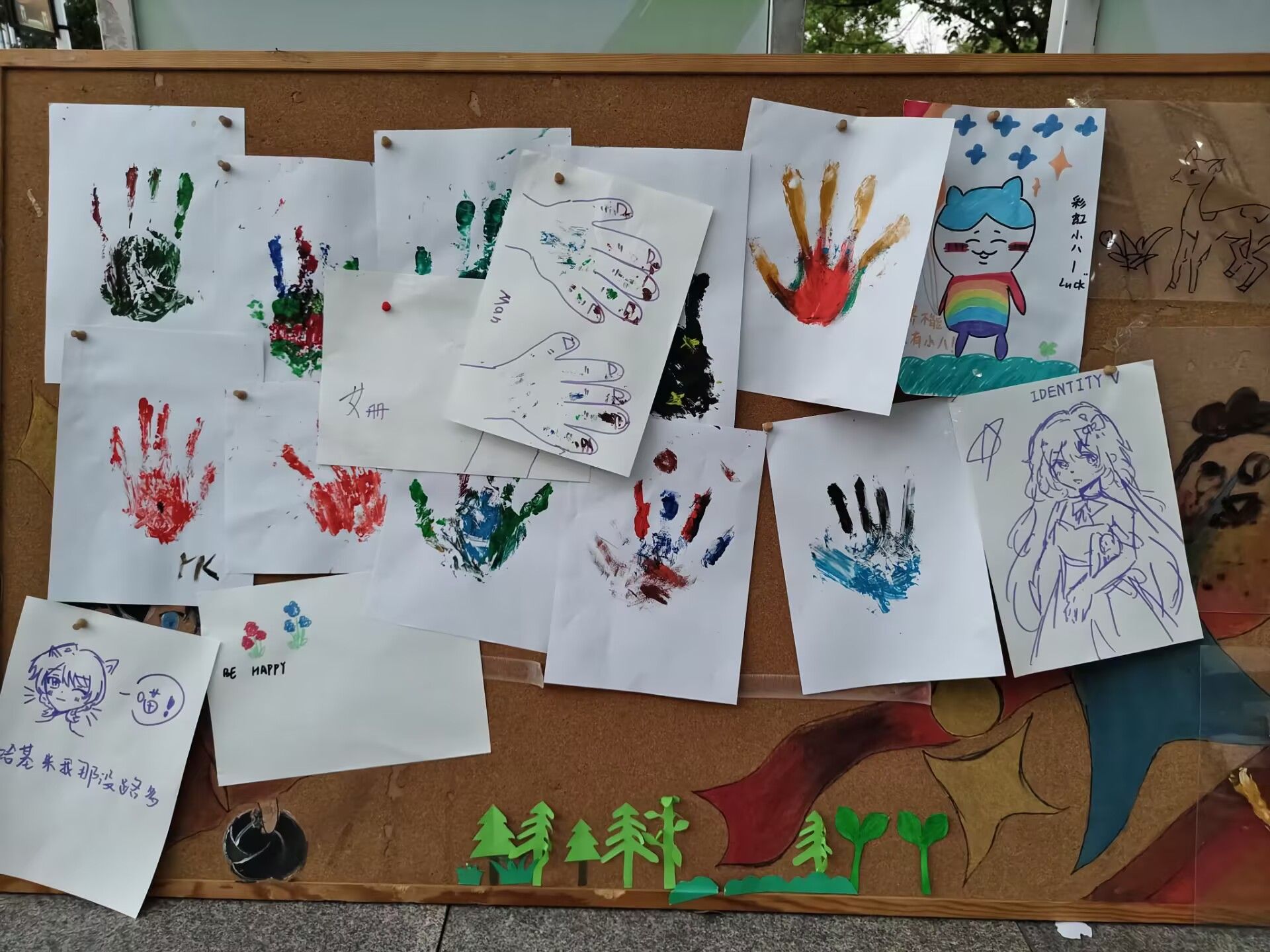 活动中,“情绪肖像画”环节引导学生通过协作或独立创作表达心境:协作组同学面对面用颜料在亚克力板上为对方绘制“情绪肖像”,以色彩笔触呈现心境;独立创作同学则通过自画像进行自我对话。随后的“与情绪击掌”环节,参与者交换画作后,用手掌蘸取颜料在亚克力板上印下掌印,象征与过往情绪和解。学生可带走画作或将其留于主题展板,供后续师生添画互动。
