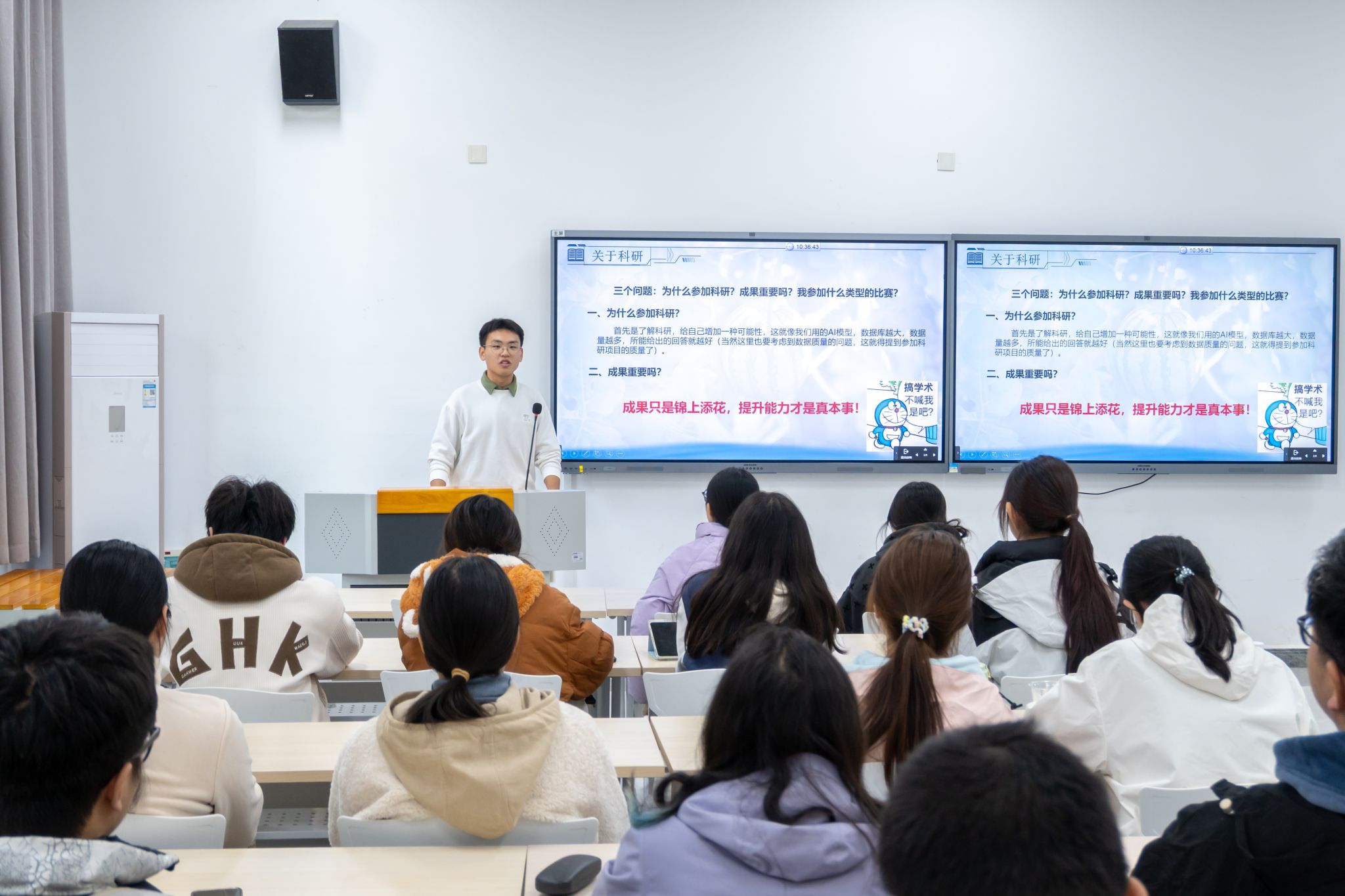 农学2201班学生王永康以“大二的成长规划”为主题,在襄阳书院第二教学楼101教室为24级学生作成长规划分享。王永康围绕“个人定位、专业经历、奖励情况、其他技能”四个方面进行了分享。