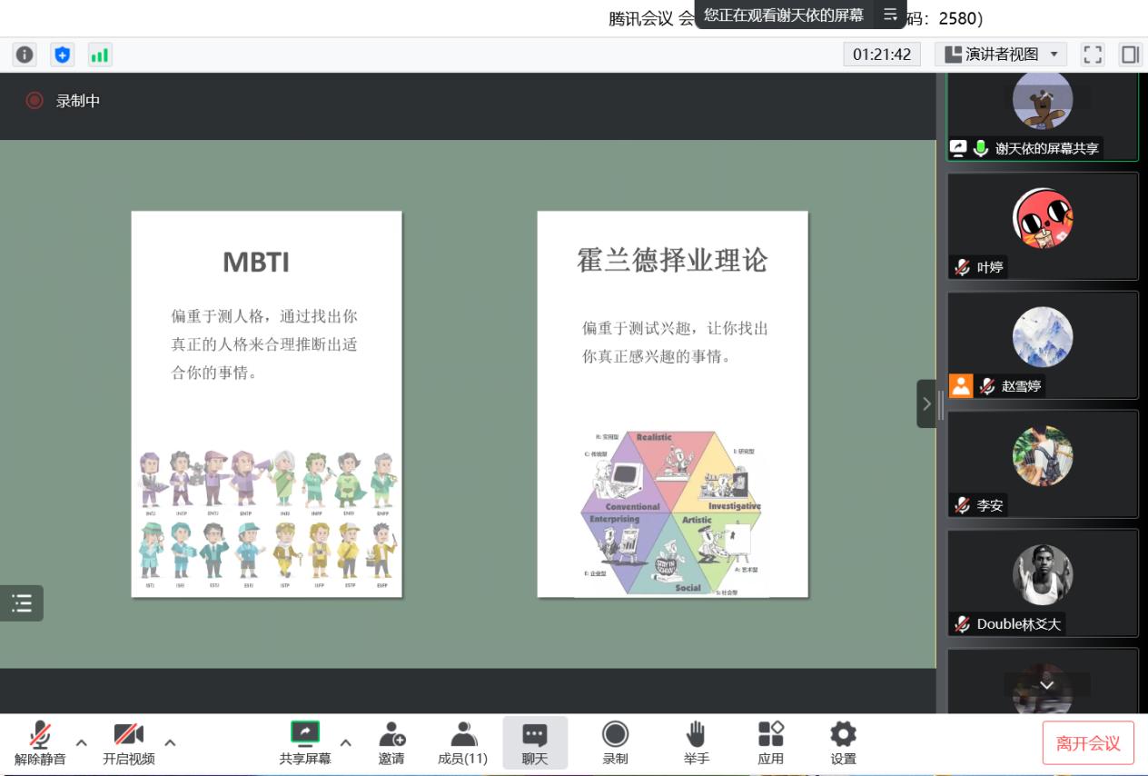 李安给大家分享了路遥的经典作品《平凡的世界》,该作品获第三届茅盾文学奖,是中国当代杰出的长篇小说。分三条线索讲述了上世纪70到80年代,孙少安孙少平两兄弟及田晓霞的成长和奋斗经历,并将时代大背景下的大事件融入小人物的发展中,展示了小人物在时代洪流中努力奋斗,辛勤劳作的平凡故事。最后李安谈到,这部作品故事情节不波澜,语言用词不夸张,用平凡的笔墨描写了平凡的故事,引人深思。谢天依从“MBTI”和“霍兰德择业理论”两个测试出发,科学分析了自身性格上的优缺点并结合外在环境,如家庭、学校和社会因素,进行职业规划,将自己的生涯范围定位于事业单位和高校之中。她相信只要耐心地学习、不断提升自己、不急功近利,理想总有一天会实现自己理想的职业。