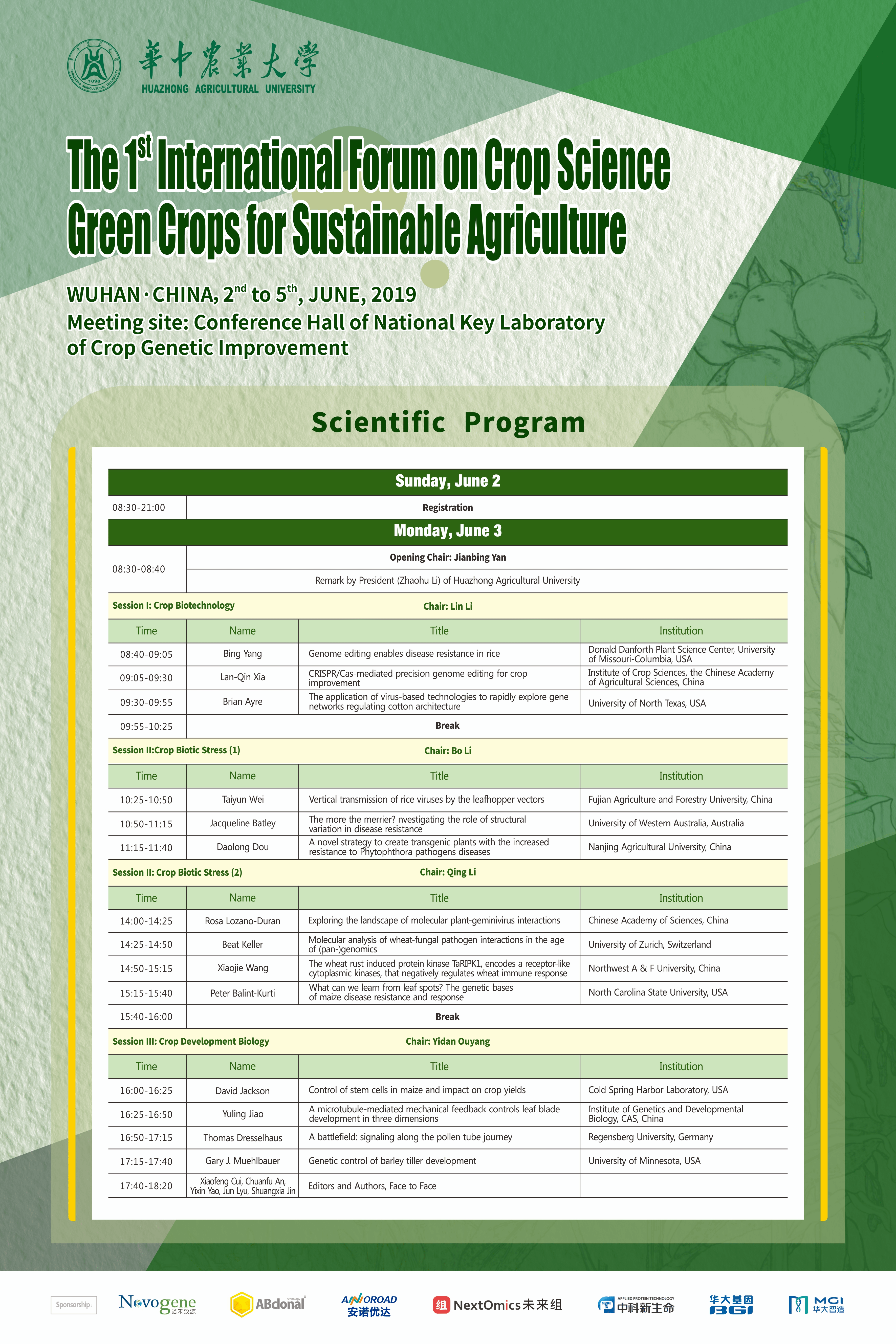召开。大会邀请了国内外作物学领域取得突出成果并具有重要学术影响的学者和优秀青年科学家进行学术报告。同时,为了更好地促进大家交流,大会也特邀Nature Communications, Molecular Plant, Nature Plants, Genome Biology以及Plant Biotechnology Journal等期刊的资深编辑参会,与大家深入交流讨论。组委会诚挚邀校内师生参加本次会议。会议地点在作物遗传改良国家重点实验室一楼大报告厅。