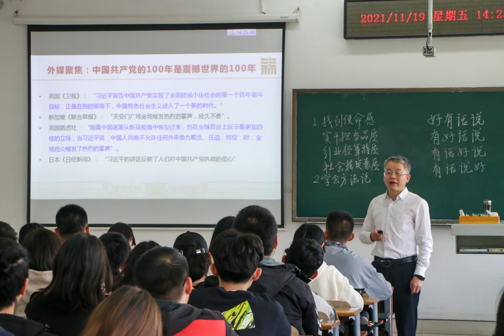 2021级学生讲授形势政策课。廖济忠以“汲取精神力量,奋斗复兴伟业”为题,对中国共产党百年历史、伟大建党精神、华农学子的使命担当三个部分进行讲解。
