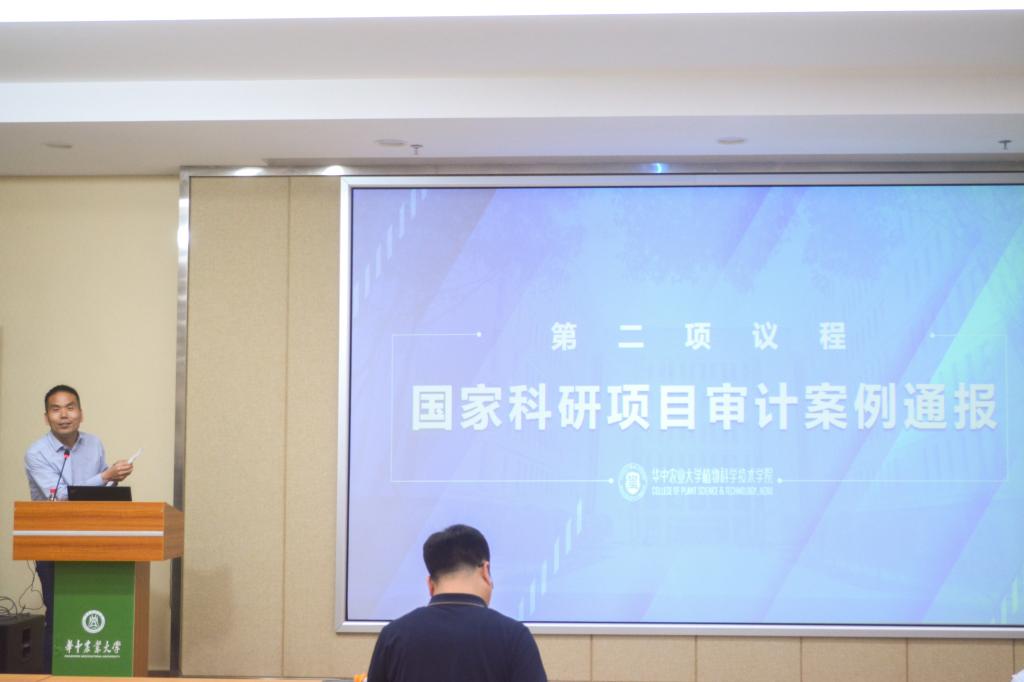 王满囷通报了国家科研项目审计案例,就“假合同套取资金”“为非项目人员发放劳务费”“用非相关的成果或非项目执行期内的成果作为考核指标”“考核指标与任务不同”等违规点提出了相关要求。