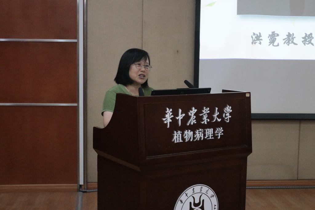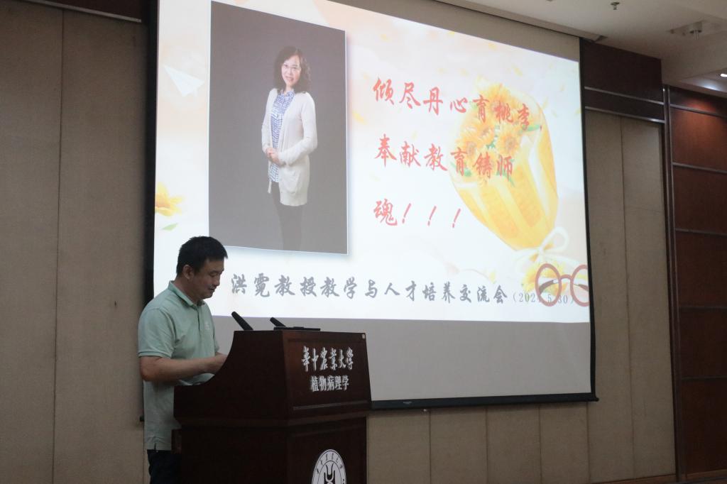 在分子楼一楼报告厅举行洪霓教授教学和人才培养交流会暨荣休座谈会。植物病理教研室全体成员、洪霓教授在读学生、党委书记周雄参加座谈会,会议由植物病理教研室主任谢甲涛主持。