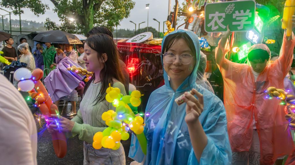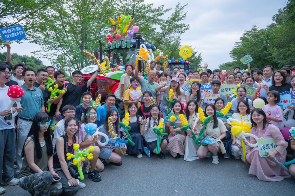师生手持油菜、棉花、玉米、大豆、小麦、水稻、蝴蝶、蘑菇等手工气球模型,展现一派生机盎然的丰收景象。正值建校126周年,126个作物种子福袋随着巡游队伍发放,寓意着毕业生像种子一样播撒在祖国大地上。