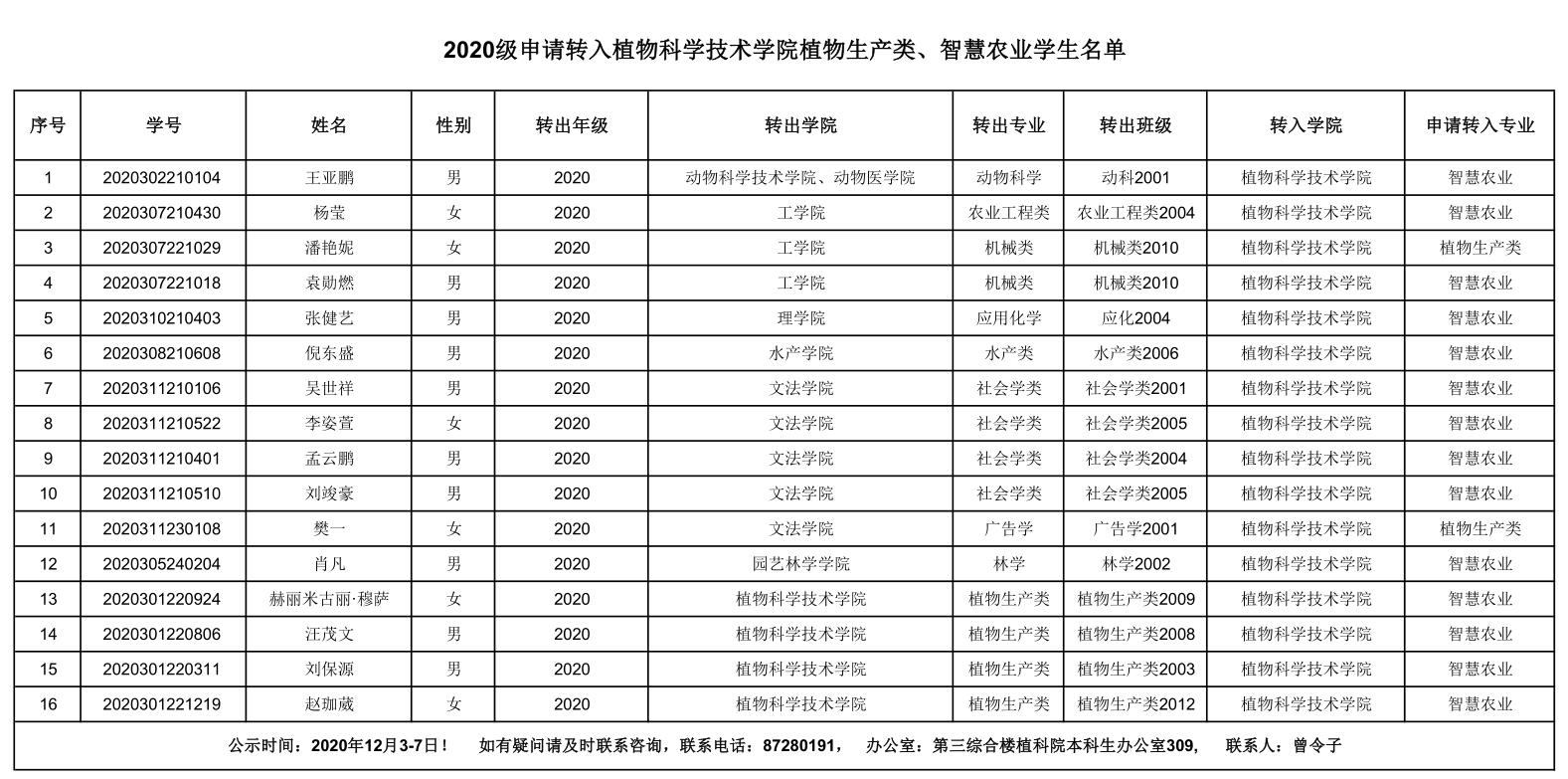 2020级申请转入91免费版 植物生产类、智慧农业学生名单