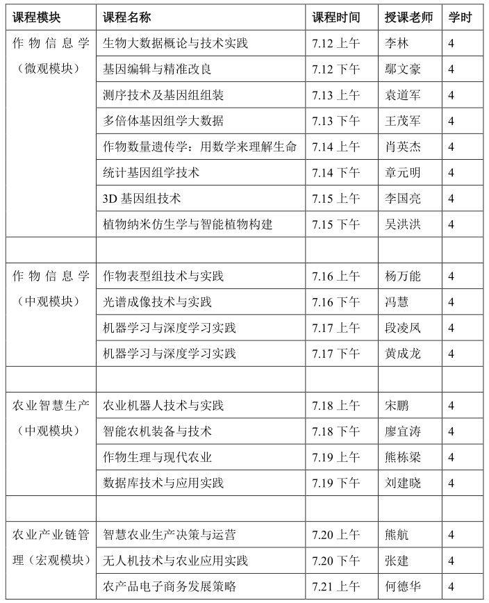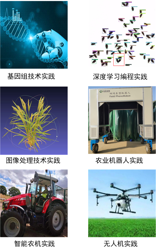 覆盖智慧农业核心实践课程,邀请19位相关教师和专家开设无人机技术、深度学习技术、数字图像处理技术、作物表型组技术、数据库技术、机器人技术、生物信息学技术、基因组学技术、农业机械化生产技术、农业经济学与现代农业等基本理论与实践课程。
