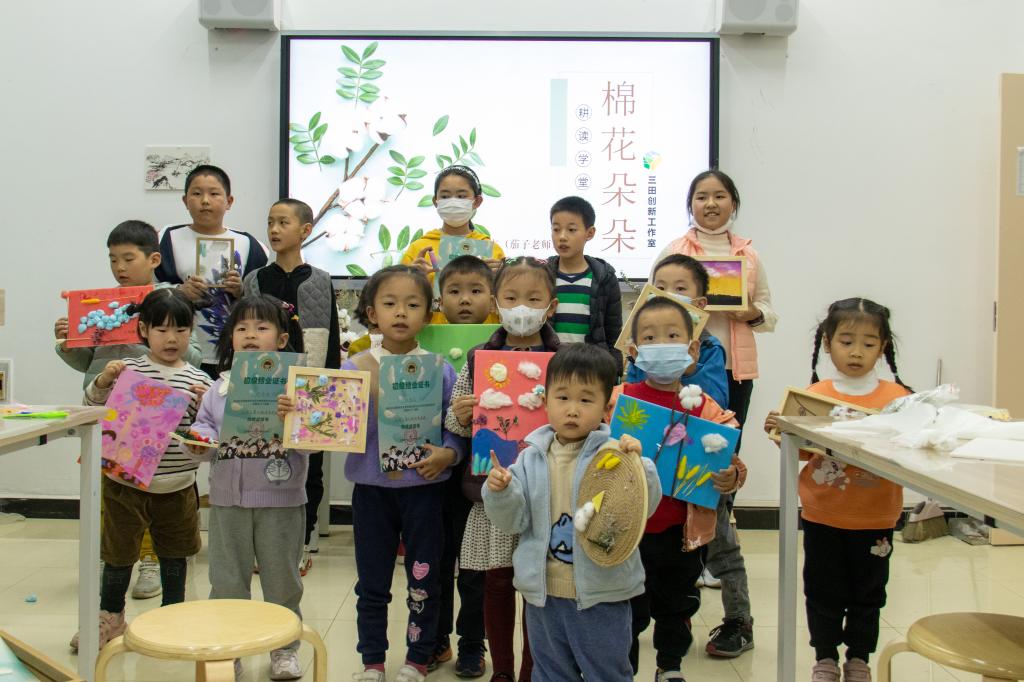 在制作棉花画这一环节中,戚杰同学首先向孩子们介绍了棉花的相关知识,吸引了孩子们对棉花的兴趣。随后,孩子们在家长的帮助下,利用棉花与其他各式各样的材料,动手制作棉花画与小工艺品,勾勒出自己脑海中天马行空的想象。有的孩子用水彩颜料在画板上绘出自己的心中奇花异草与水秀山明,有的孩子则在小漂流瓶里填充自己的云端梦境,有的孩子选择在相框中搭建自己的理想城堡。孩子们最后做好的棉花画与小工艺品风格迥异,各具特色。