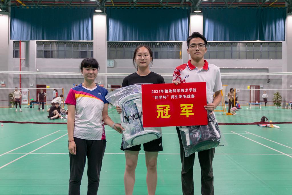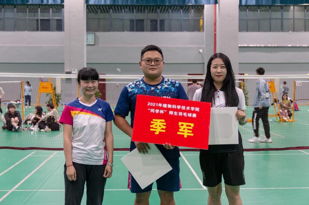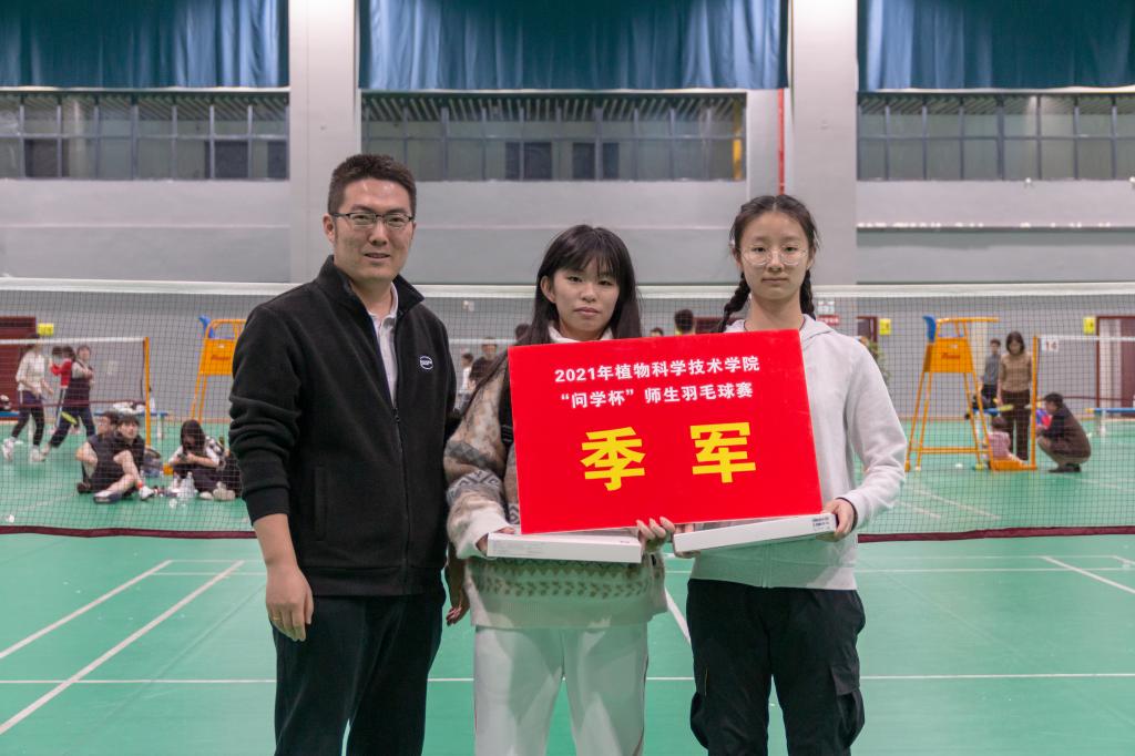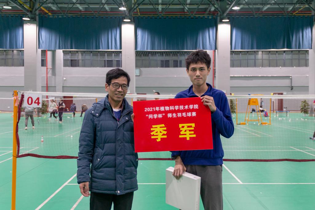 智农2101班吴乐驰邀请到了副教授徐胜臻作为自己的搭档,两人在赛场上配合默契,一路角逐。“好球!”赛场上不时传来徐胜臻的鼓励声。羽毛球被击飞过网,位于前方的吴乐驰熟练弯腰,后方的徐胜臻乘势起跳,一记完美的扣球,使他们拿下关键一分。二人最终顺利晋级四强,斩获季军。吴乐驰激动地表示:“无论是在球技方面还是生活方面,徐老师给我了许多诚挚、中肯的建议,让我收获良多。非常开心能参与这样的体育赛事,让我与老师有了更多交流的机会。”