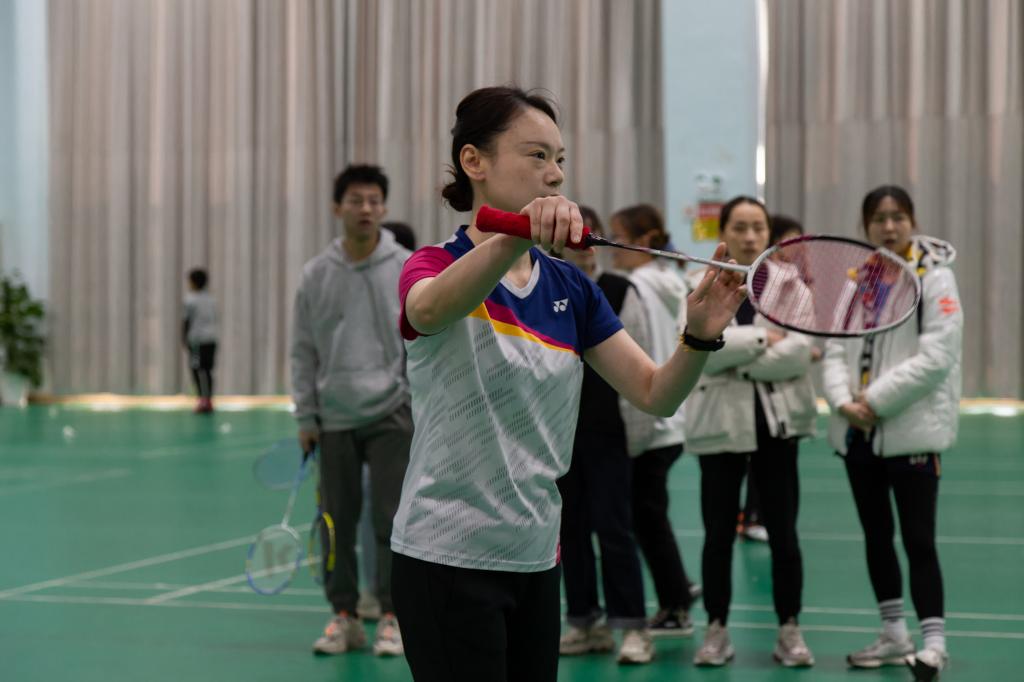 双方选手站定,副教授闵玲率先发球。与对手胶着几个回合后,闵玲采取了吊杀上网战术:点杀、吊球,眼看羽毛球即将落在场地边,对手被动向前迎击。闵玲迅速上网,快速平推;对手来不及转身,羽毛球沿对角线落下。霎时,场下啦啦队的欢呼声此起彼伏。据了解,闵玲是教工羽毛球队的一名老将,在日常生活中她常邀请同学们一起打球。她分享到,羽毛球是一项很好地团体运动,场地限制小,技术门槛低。而团体运动既能锻炼身体、释放科研压力,又能快速拉近师生距离,使师生间的交流更为高效。