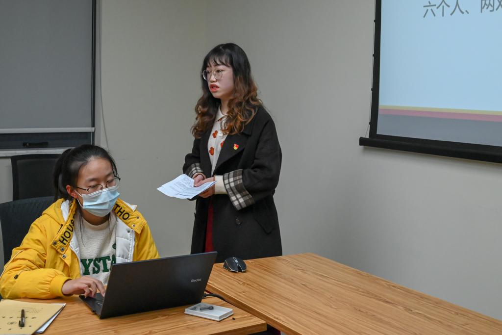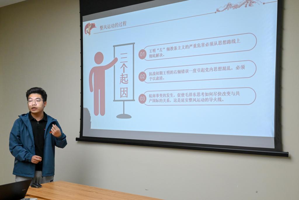 李泽辰则以延安整风运动为切入点,讲述了延安整风运动的三个起因、四个历史意义以及我们党从延安整风运动中得出的启示。他指出,作为新时代青年,我们要积极展开批评与自我批评。同时要坚持高举马克思主义的思想旗帜,不断提升自己的综合能力与综合素养。会上,李泽辰用三句话勉励大家:“学习马克思主义和改造世界观是一辈子都要坚持不懈的事情”;“活到老,学到老,改造到老”;“延安整风运动的好传统,好作风,我们必须代代相传,并不断地发扬光大。”