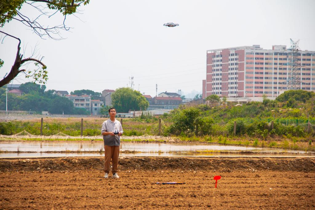 随后,选手们来到室外场地进行第二项考核——无人机现场实操。比赛现场的四个方位分别放置了四座无人机停机坪,比赛中由一人遥控无人机,另外四人充当观察员,帮助操作员确定无人机的飞行方向。选手需要根据袁金展老师下达的指令进行操作,并最终在指定停机坪上准确降落。这不仅是对操作员的心态与技术的考察,更是团队间默契度的体现。袁金展表示,“这只是实操的第一个环节,后续还会进行无人机播种和5人100亩稻田管理操作比赛。”