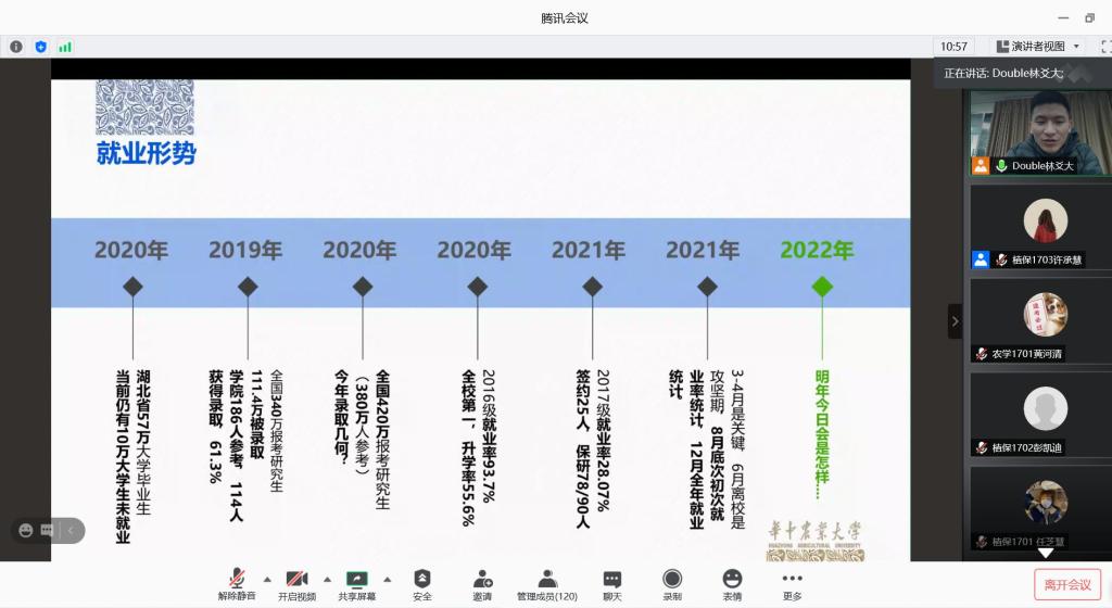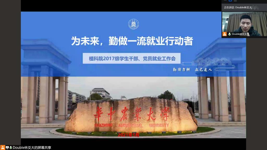 2017级辅导员熊攀攀在腾讯会议召开题为“为未来,勤做一流就业行动者”的就业工作会,2017级历届学生干部和全体党员参加。