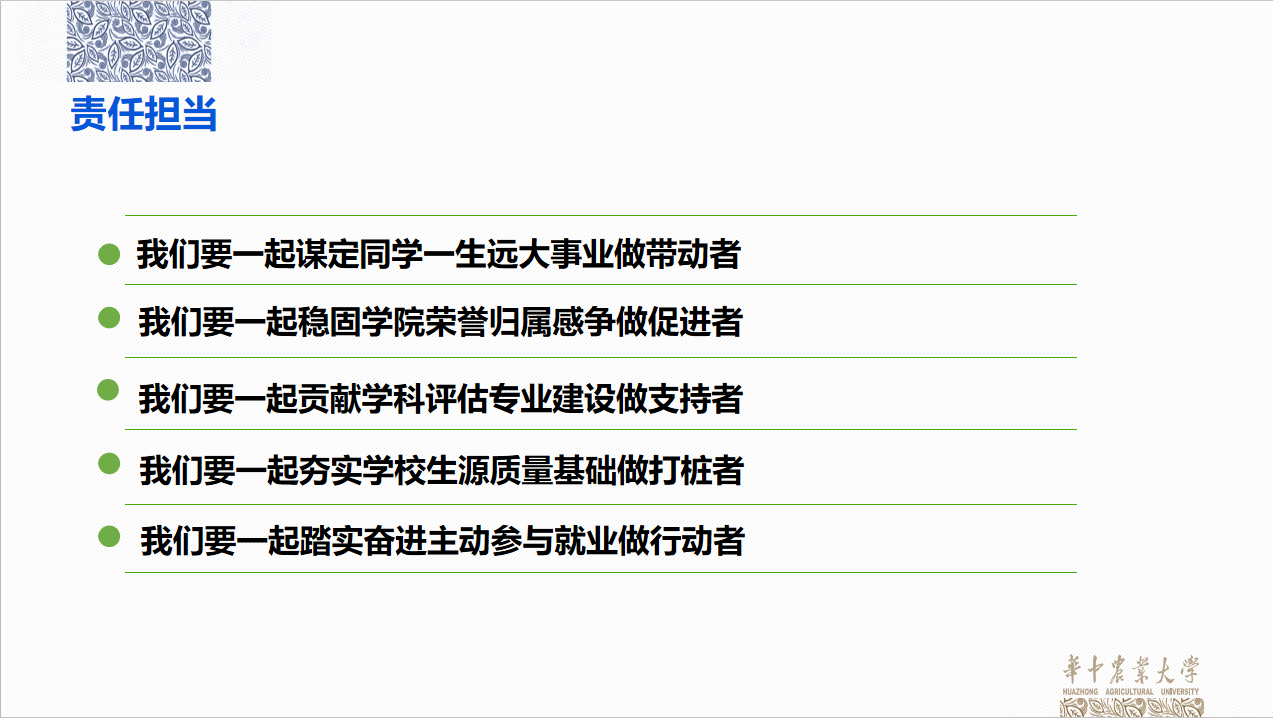 荣誉归属感争做促进者、一起贡献学科评估专业建设做支持者、一起夯实学校生源质量基础做打桩者、一起踏实奋进主动参与就业做行动者。“