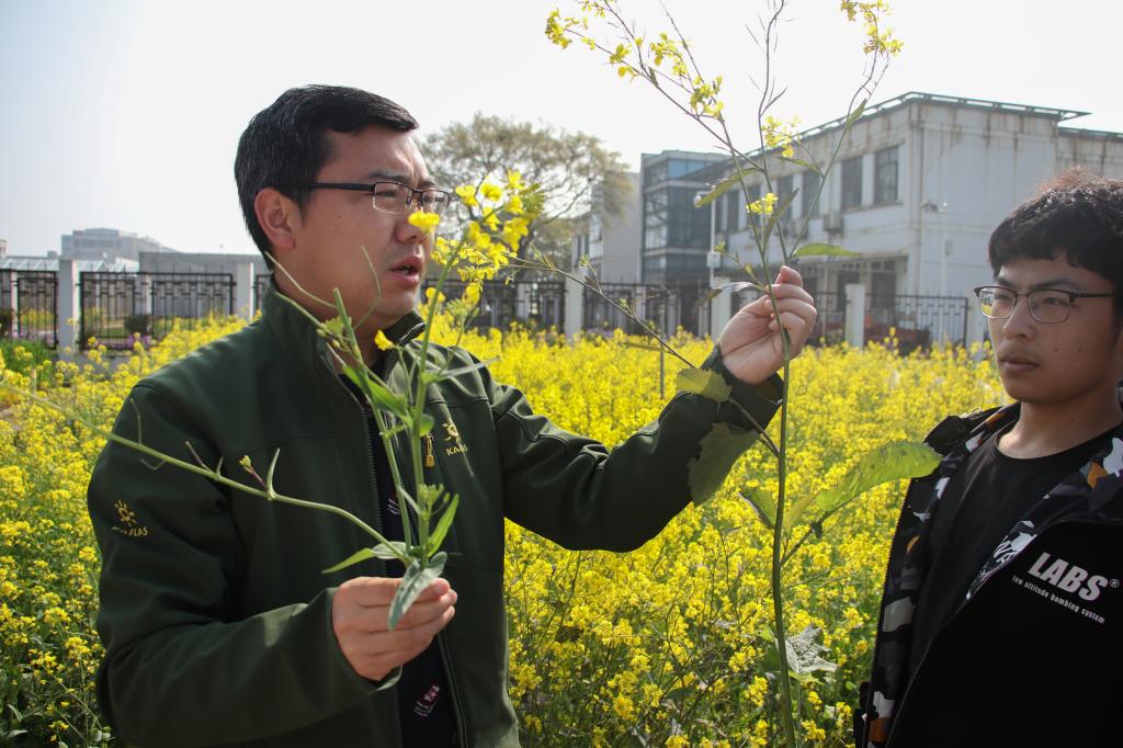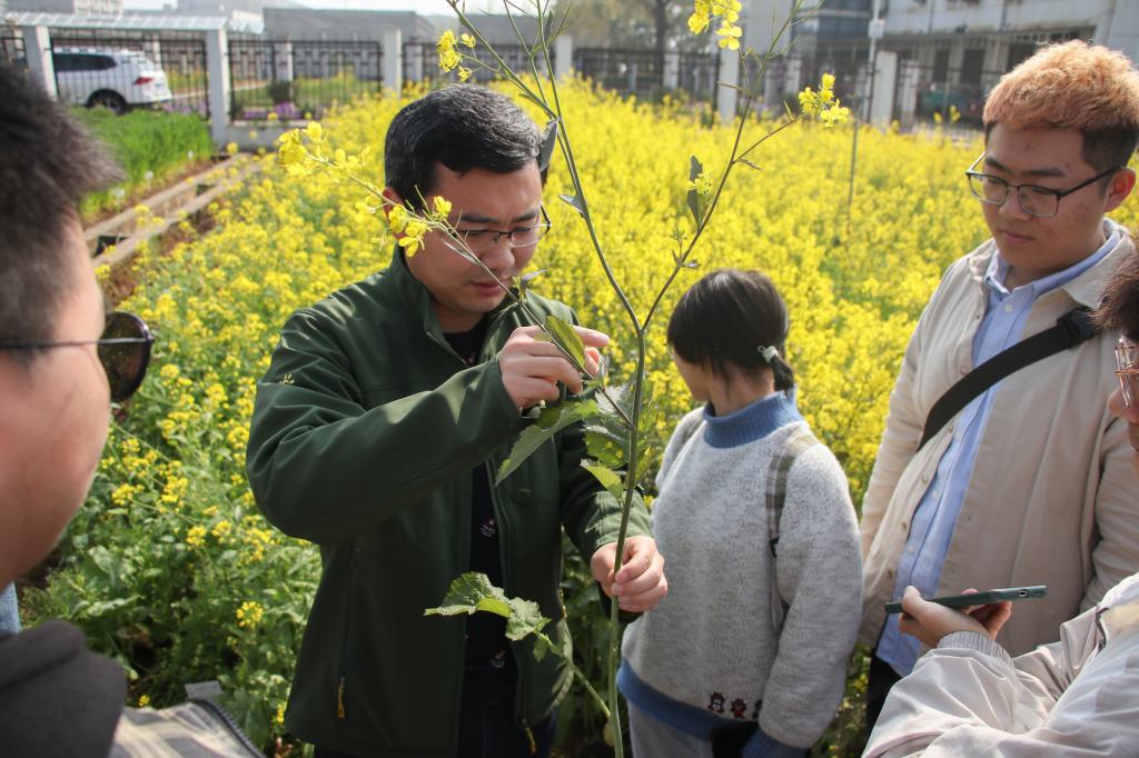 活动中,徐正华首先向大家介绍了油菜的三种类型—甘蓝型、白菜型及芥菜型,他指出,甘蓝型油菜因其产量高、抗性强、品质优而在生产上最为常见。他还告诉同学们,油菜有六大用途分别是油用、菜用、饲用、花用、肥用、蜜用。接着,徐正华带领同学们来到油菜基地。金灿灿的油菜地里,风拂花蕊,蜂随风舞。“油菜三种类型在植株大小、植株颜色、叶片形态、花瓣结构、角果与茎秆的夹角、叶片与茎秆之间的关系以及开花时花蕾位置这几种性状上有着较易区别的特征”,徐正华轻轻摘下几束略有不同的油菜花向同学们详细的介绍道。此外,他向同学们介绍了我国油菜发展面临的问题以及国家提出的策略。他指出,应当大力推进新品种新技术示范推广和全程机械化,但是由于油菜在收获时具有易裂角的特点目前机械化收获时损失率较大。他说道:“油菜生产上要解决的问题还有很多,包括产量的提升、全程机械化的推进、品质和抗病性的提升等等问题,或许解决这些问题的使命会落在同学们的肩上。”
