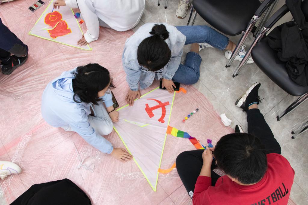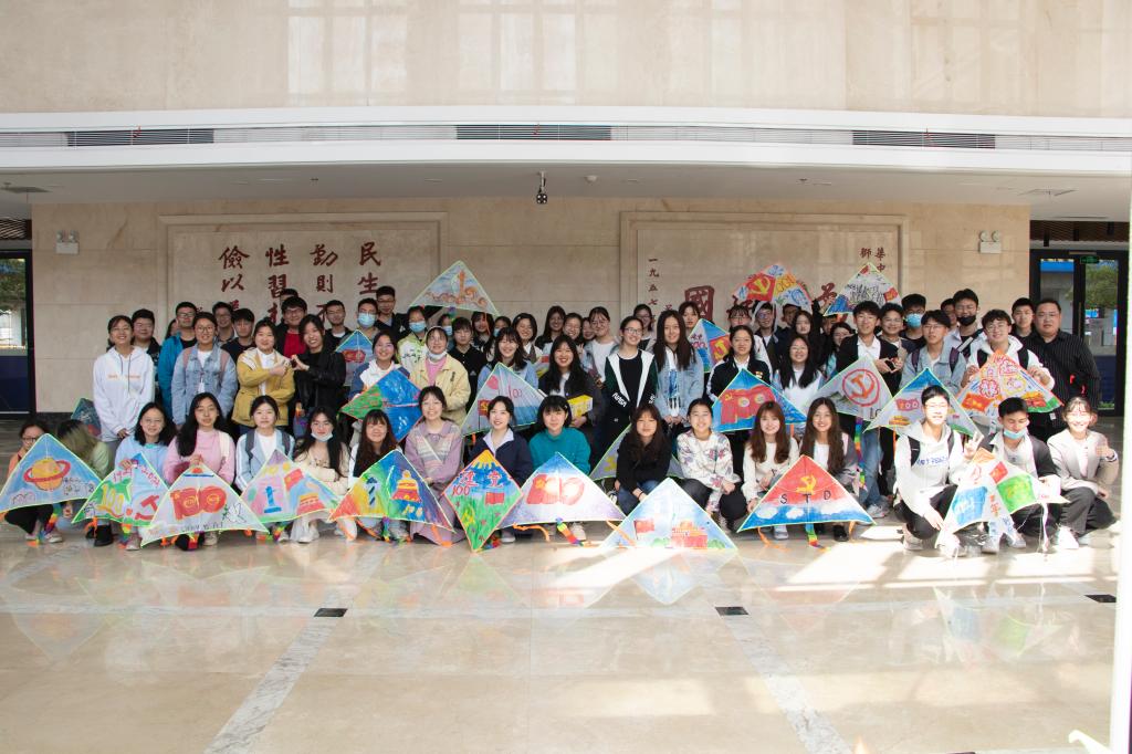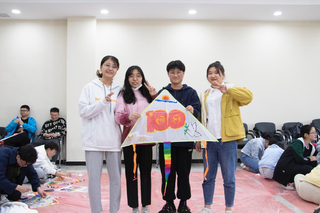 党史知识竞答小组赛环节中,在座的学生干部们充分运用自己学习到的党史知识,认真思考,积极参与,踊跃回答问题。在风鸢创作环节,学生干部们各展其才,依托中国共产党100周年这一主题,将自己对党的认识、理解以及祝福通过手中的画笔呈现在风鸢之上。主题风鸢创作完成后,所有参与活动的学生干部于三综大厅合影留念。