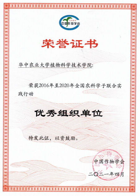荣获2016-2020年全国农科学子联合实践行动“优秀组织单位”,李召虎、严建兵、朱正宁、曹凑贵、熊海林等5位老师荣获“特别贡献奖”,边银丙、谢甲涛、任喜峰、刘立军等4位老师荣获“优秀指导教师”,贾浩洋、熊攀攀等2位老师荣获“先进工作者”,隋宪鑫、申璐等2位同学荣获“优秀实践队员”。