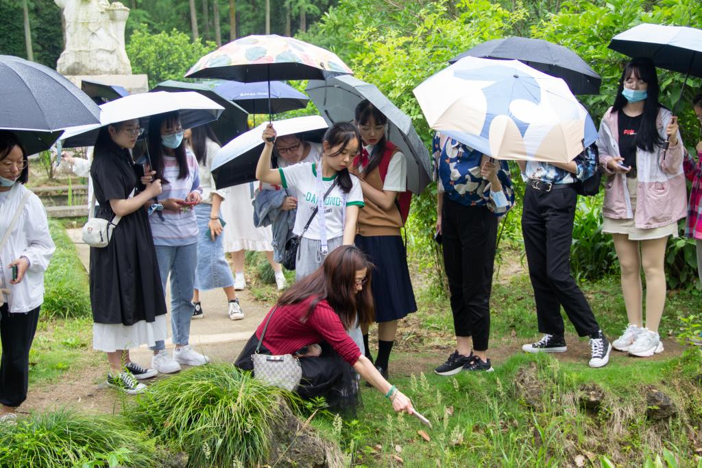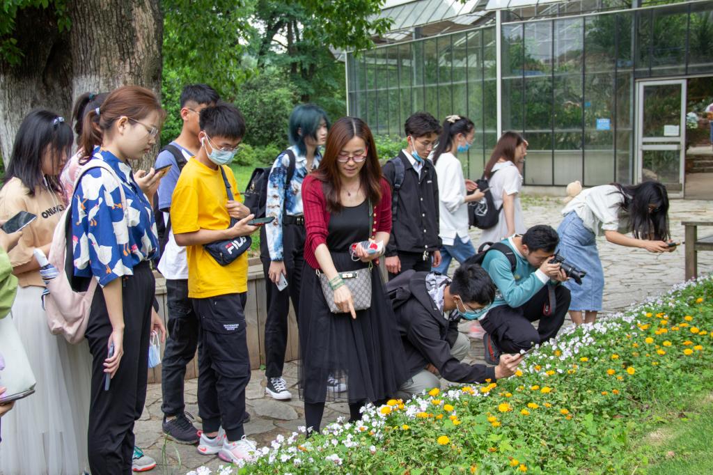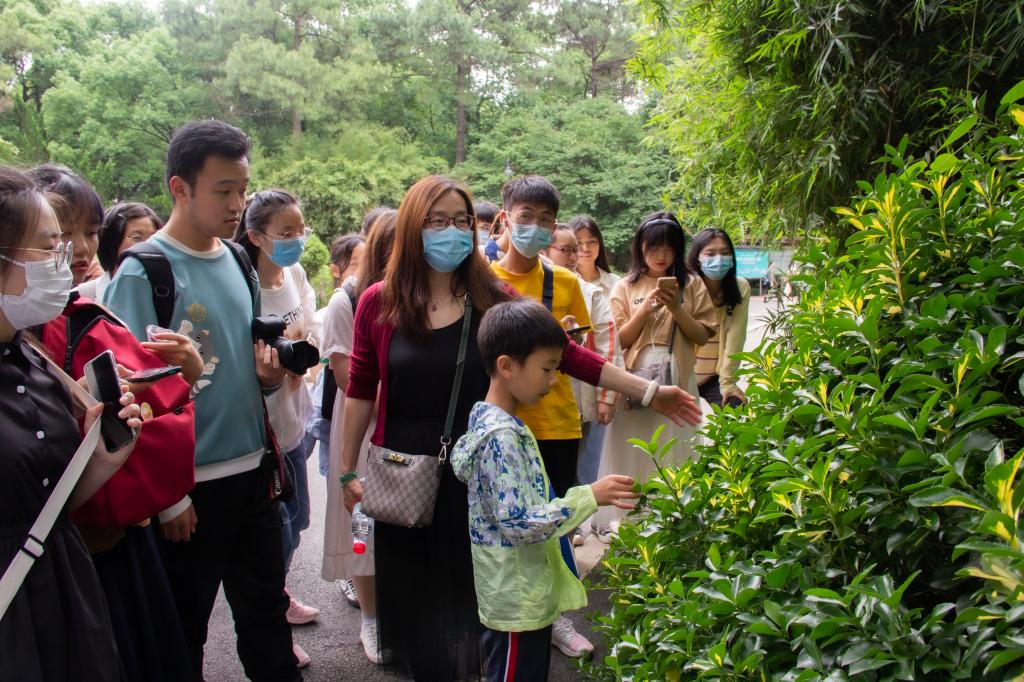 师生到达植物园后,同学们首先在王莉的带领下参观了牡丹园、杜鹃园、梅园、药园及猕猴桃园。院内植物丛生,同学们活似置身于一个植物王国。王莉边走边向同学们普及植物知识,她介绍了卫矛科的大叶黄杨,忍冬科的法国冬青,酢浆草科的红花酢浆草等常见植物,并讲授了同学们如何从果实、花、茎、叶的角度去分辨各种植物。