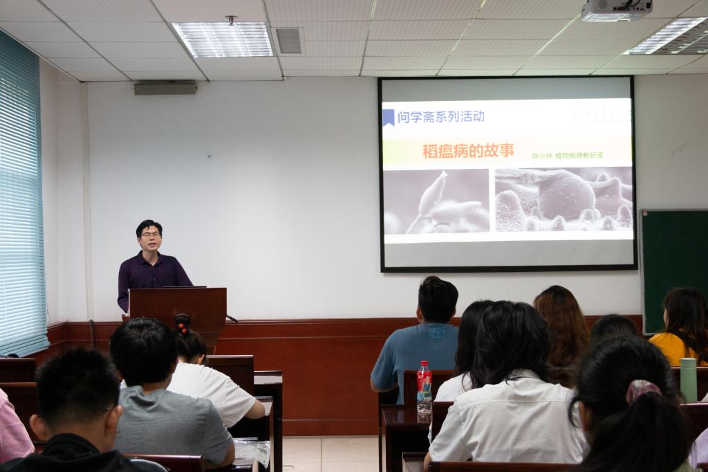 “问学斋”系列活动第二百五十九期于分子楼116会议室如期举行。来自植物病理教研室的陈小林老师热情地与大家分享了他的求学经历、科研故事与人生感悟,并简要介绍了与稻瘟病有关的知识以及他目前的研究成果。