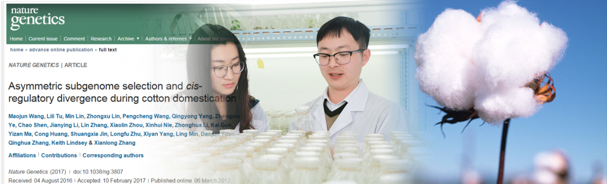 Nowadays, the worldwide academic journal “Nature Genetics”(IF=31.616) published the latest results of the research online which covered by the cotton research group of HZAU leaded by Pro. Zhang Xianlong. These results are about the selection of asymmetric sub-genome and the diversity of cis-regulatory during the process of cotton’s domestication. Not only this research proposed the genetic foundation for the domestication of cotton’s fiber for the first time, but also described the effect on the transcriptional regulation of gene by domestication, This research is a great progress in the area of the cotton’s genome research and it can guide the development of cotton’s functional genome research and genetic improvement importantly.