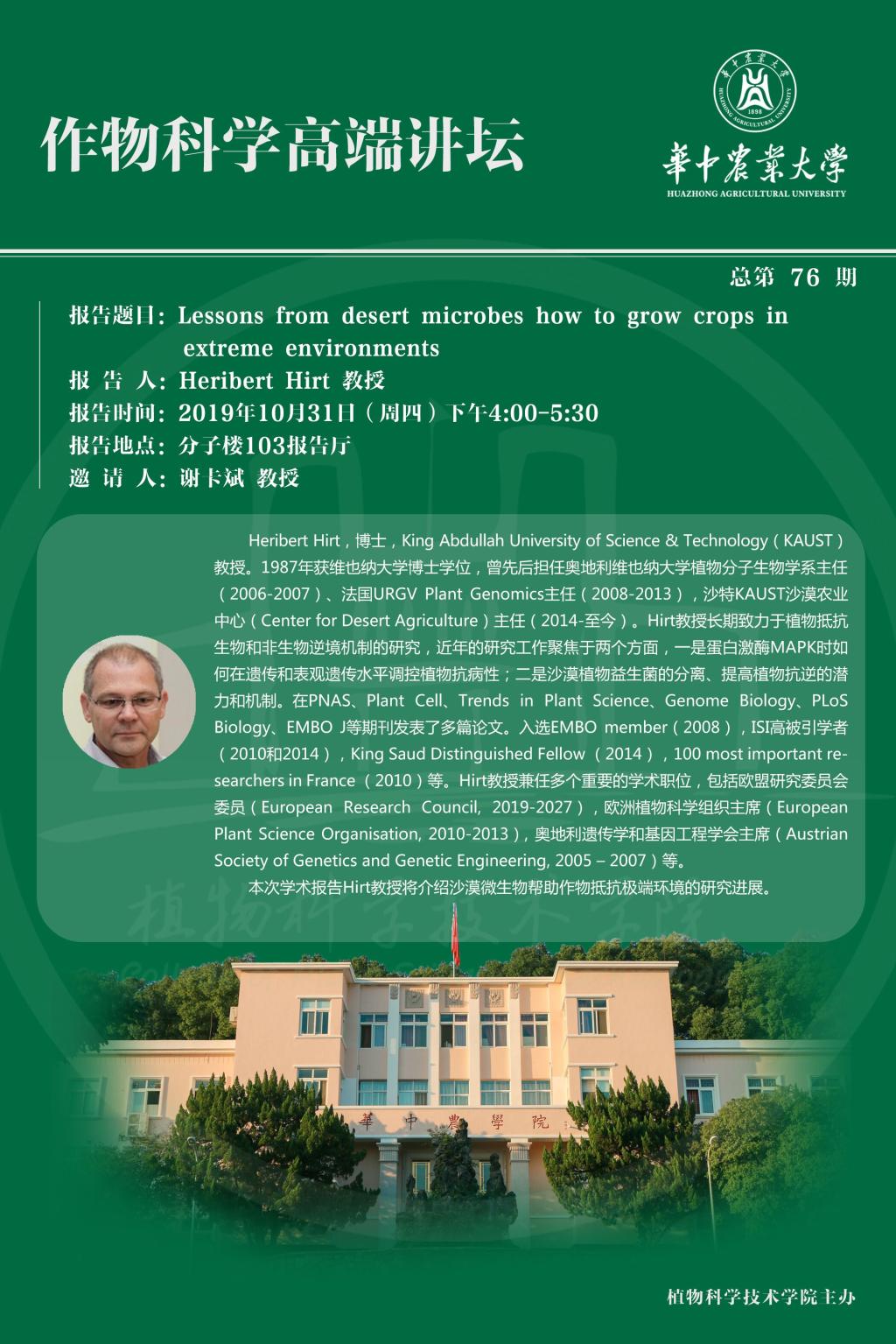 Professor Hirt will introduce the research progress of desert microbes to help crops resist extreme environments.