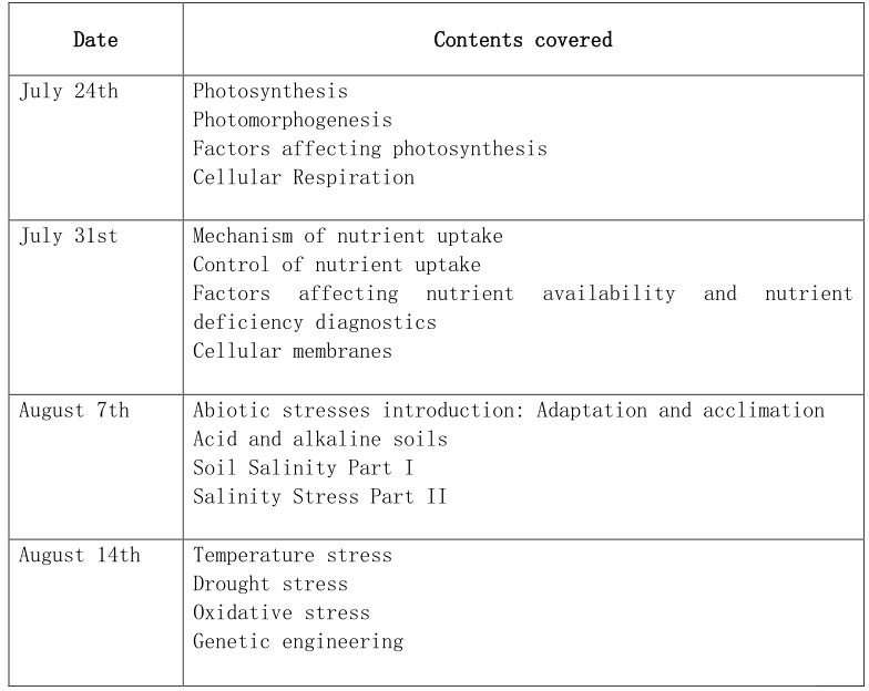 Plant Stress Physiology will cover abiotic stress affects plant growth and how tolerant plants responds to these stresses. Particular focus will be given to how membrane transport mechanisms affected during soil salinity, alkalinity, acidity, aluminium toxicity, drought and temperature stresses and how biotechnology would help to improve food production by combating these stresses.